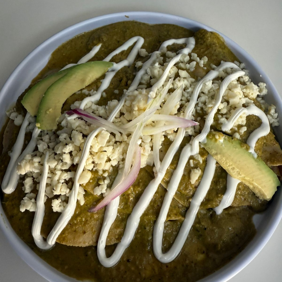 Tortilla de maíz rellena de pechuga de pollo, bañadas en salsa de chile poblano cremosa, se acompaña con queso manchego, aguacate y cebolla.