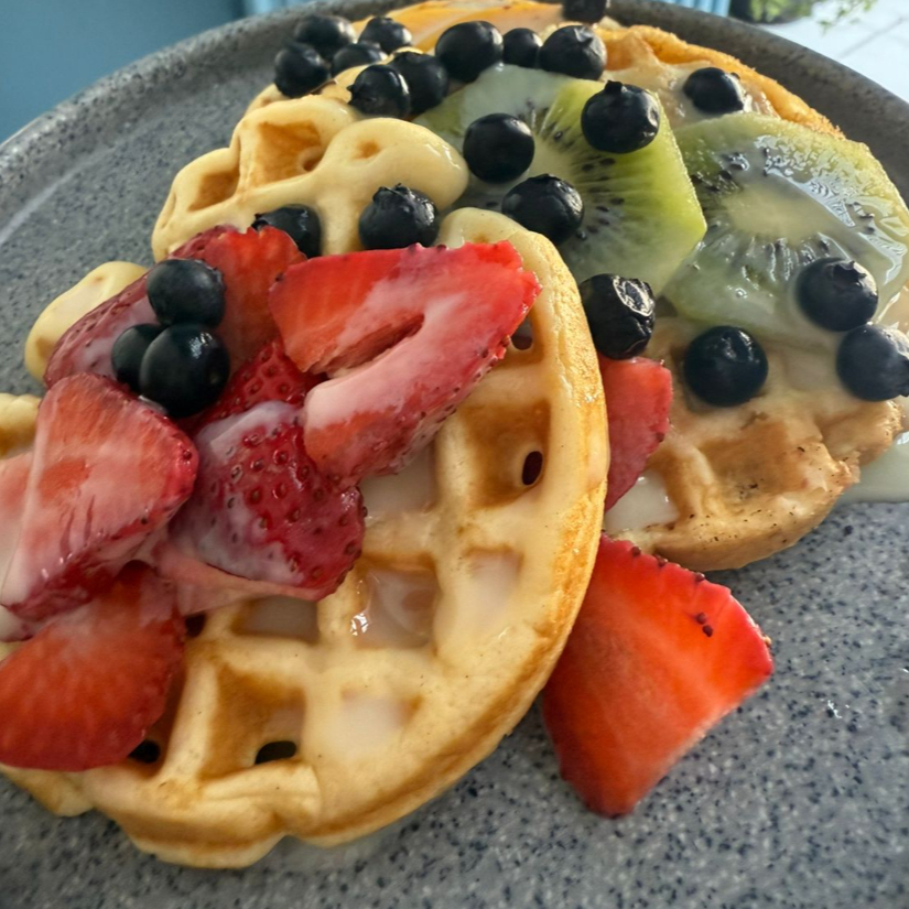 Waffles acompañados con frutos de la temporada, duraznos en almíbar y se baña con lechera y miel. (4 piezas de waffles)