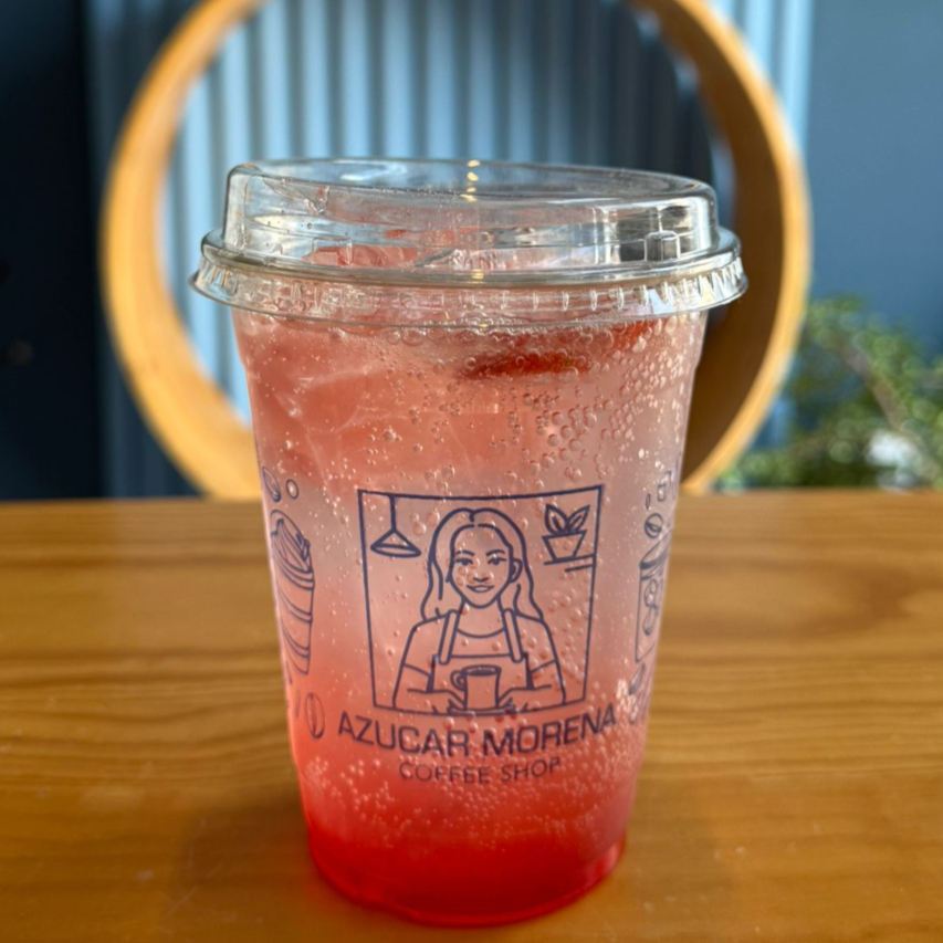 Limonada fresca con agua mineral y extracto de jugo de limón y endulzante de fresa.