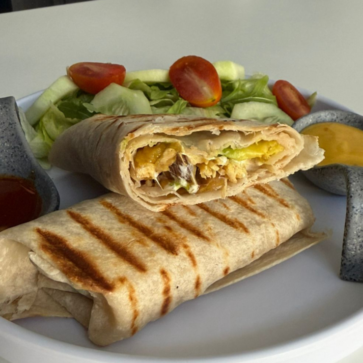 Tortilla de wrap con los aderezos de la casa, queso manchego, trozos de pechuga de pollo y se acompaña con una pequeña ensalada.