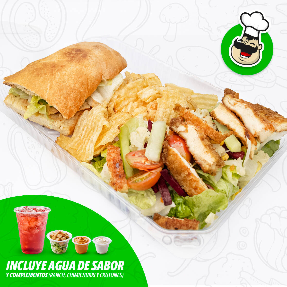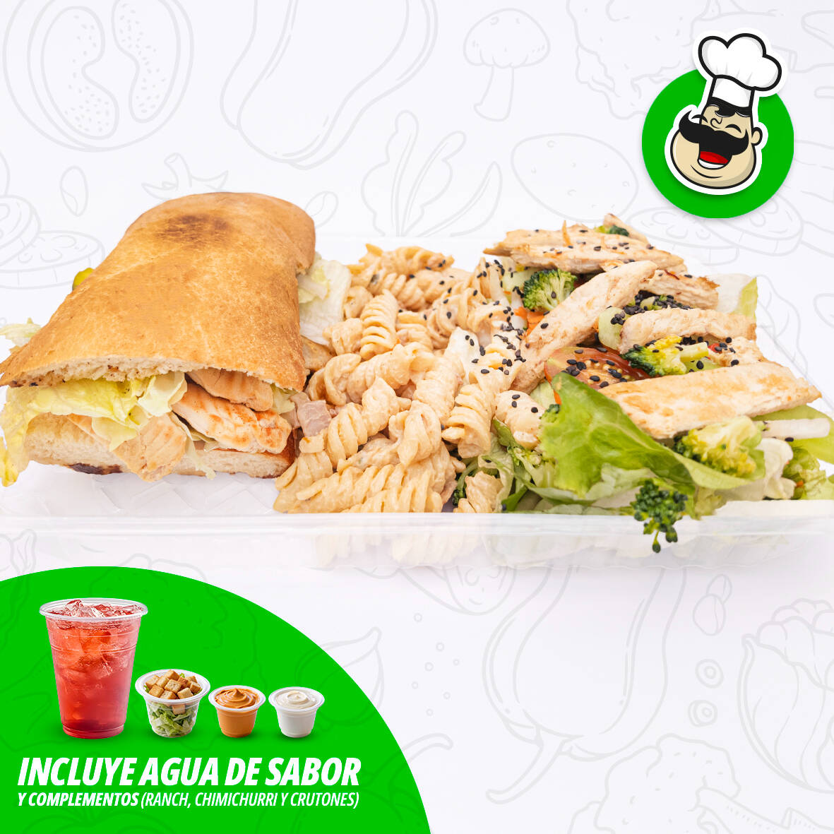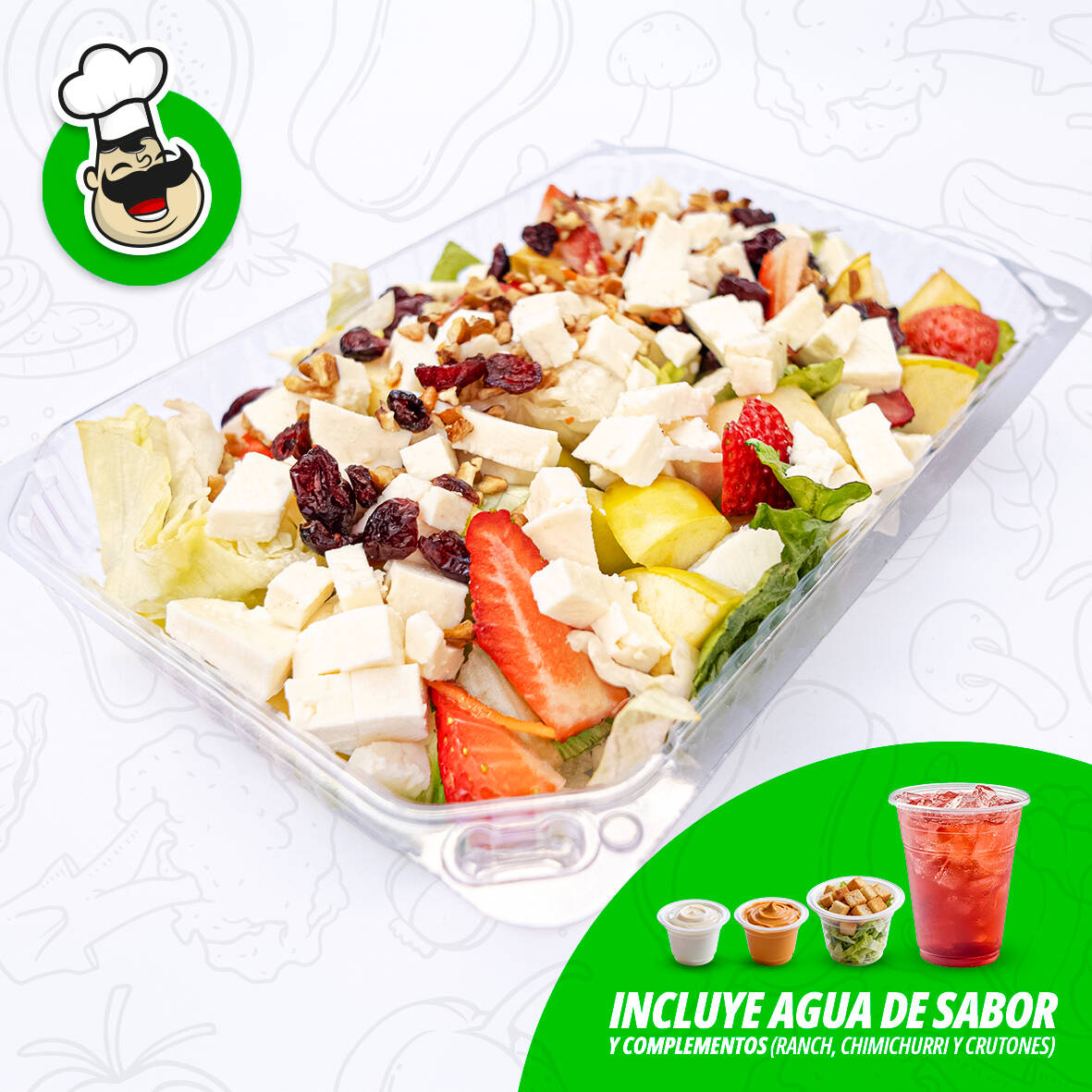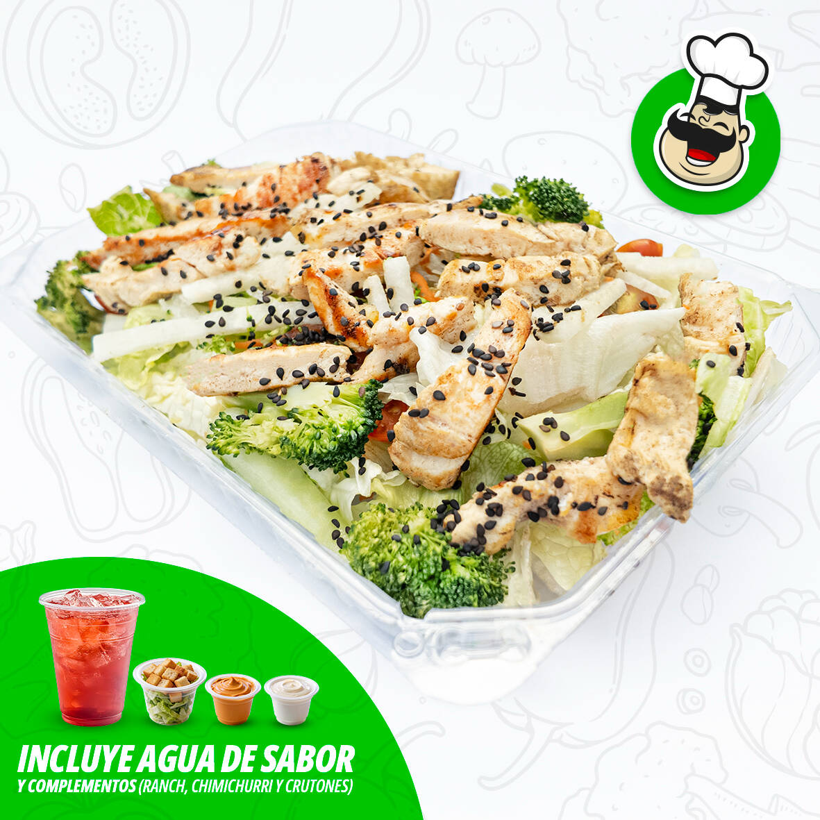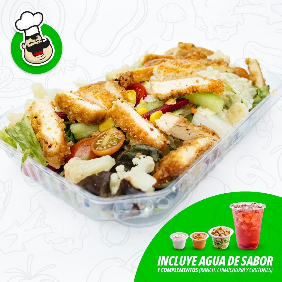 Lechugas, zanahoria rallada, jícama, pepino, brócoli, jitomate Cherry, pasta con mayonesa y ajonjolí negro, pasta con mayonesa, aderezos chimichurri ranch y medio litro de agua