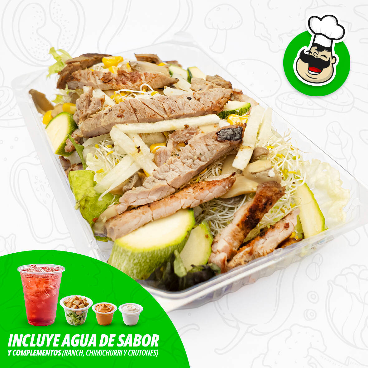 Lechugas, zanahoria rallada, champiñones, calabacitas, germinado, jícama, granos de elote, pasta con mayonesa, aderezos chimichurri ranch y medio litro de agua día.