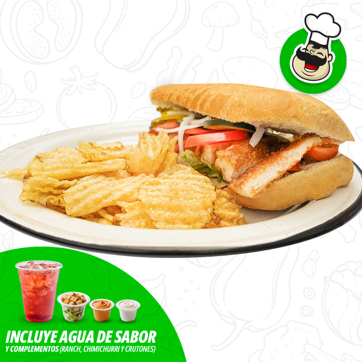 Todos los Baguetones incluyen: papas tipo sabritas, agua fresca, lechuga, pepino, jitomate, cebolla, pepinillos, morrón, mayonesa, chiles en vinagre y queso manchego.