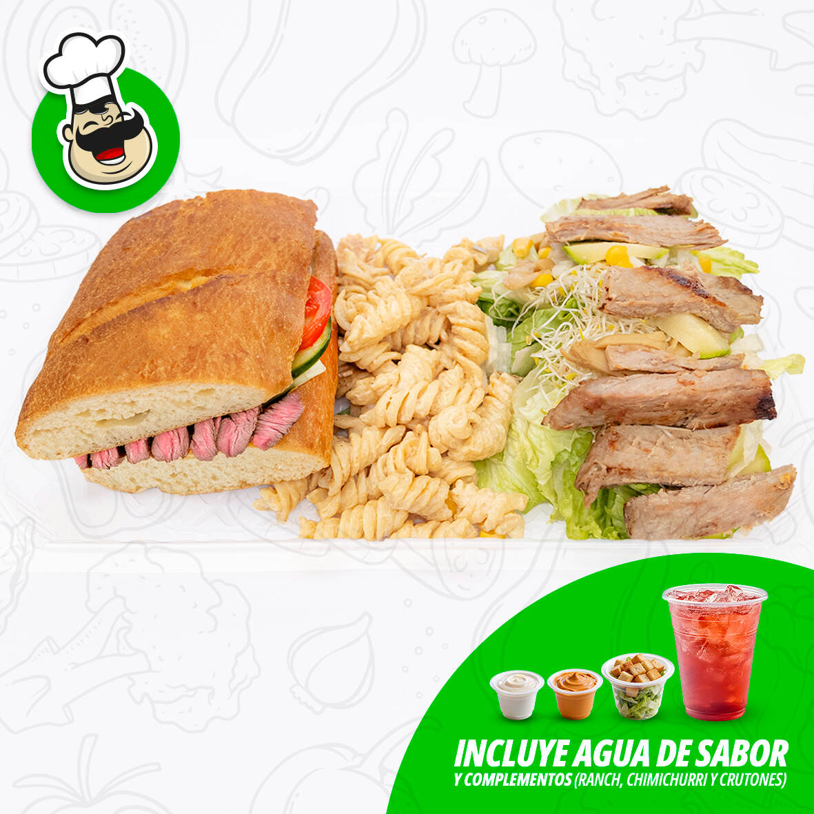 Combos Bagueton de medio Baguette, porción pequeña de Ensalada, aderezo ranch y chimichurri y porción de pasta con mayonesa y medio litro de agua del día. Ejemplo (Si el baguete es de arrachera la ensalada va de arrachera)
