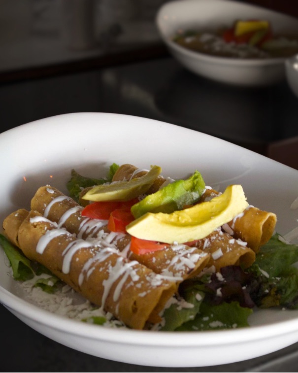 5 Tacos dorados en tortillas de maíz rellenos de barbacoa, lechuga, crema y queso rallado.
