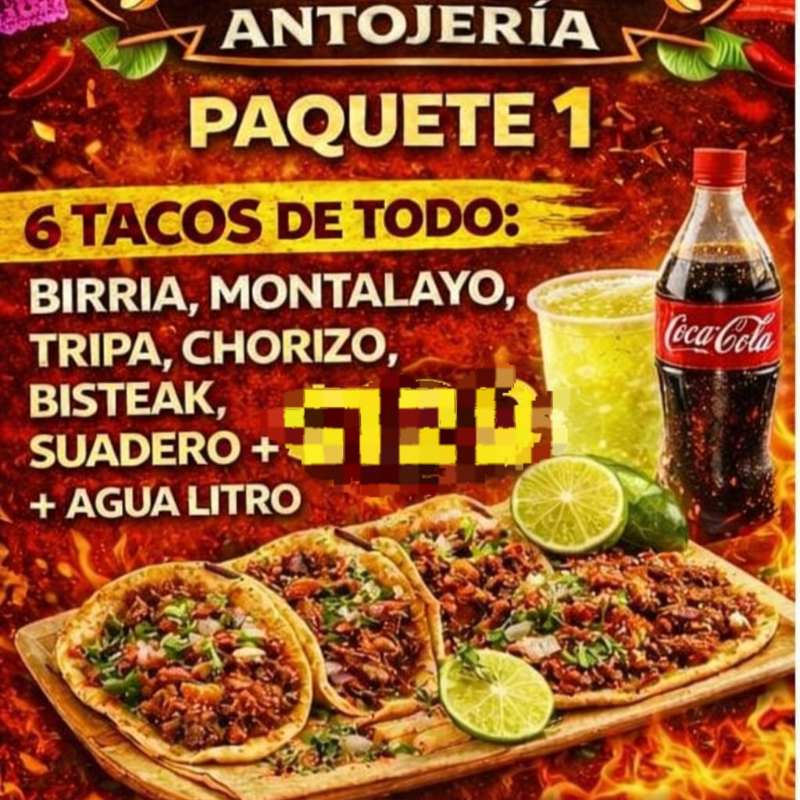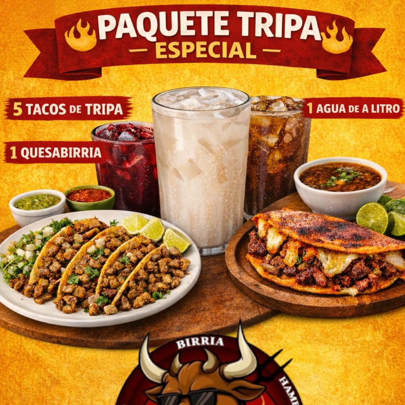 TACO DE BIRRIA*1 + Taco Chorizo*1 + Taco Tripa*1 + Taco Suadero*1 + Taco Bistec*1 + taco montalayo*1 + Agua de Jamaica 1litro*1