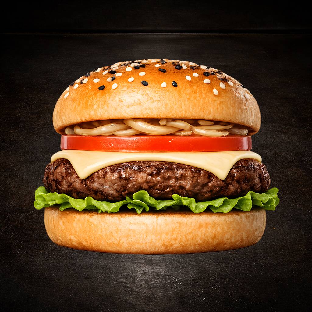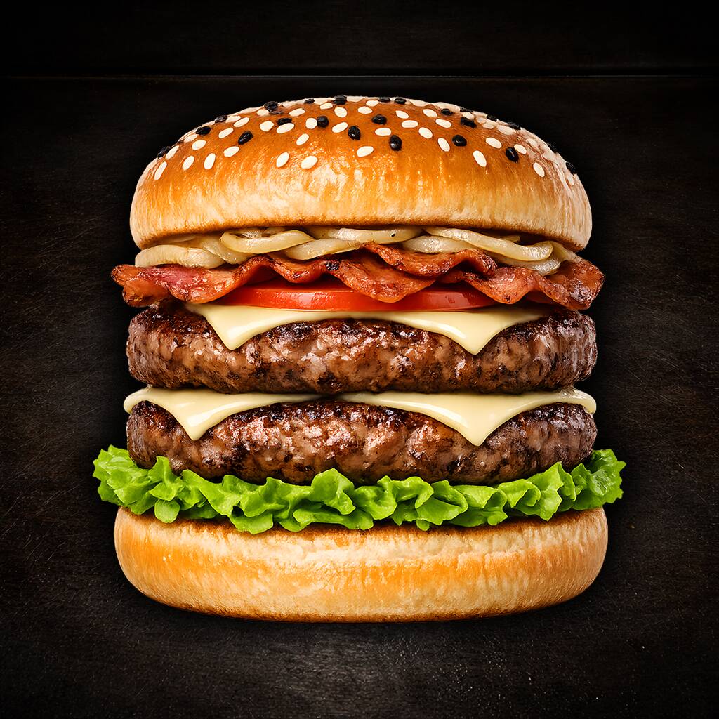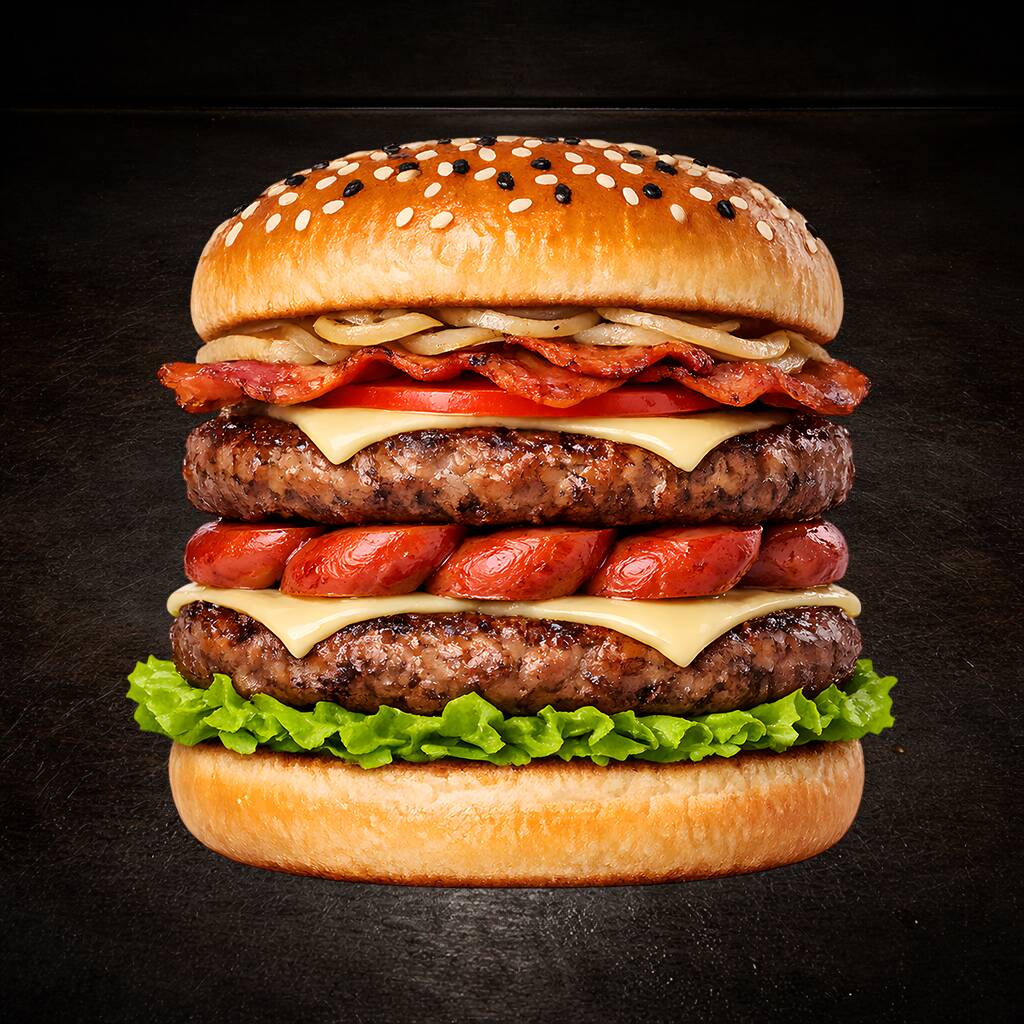 Dos porciones de Sirloin de 150 g. c/u, tocino, queso, cebollita asada y vegetales. Doble carne, doble poder. Quien la termina, obtiene respeto inmediato del clan… y un poco de sueño.