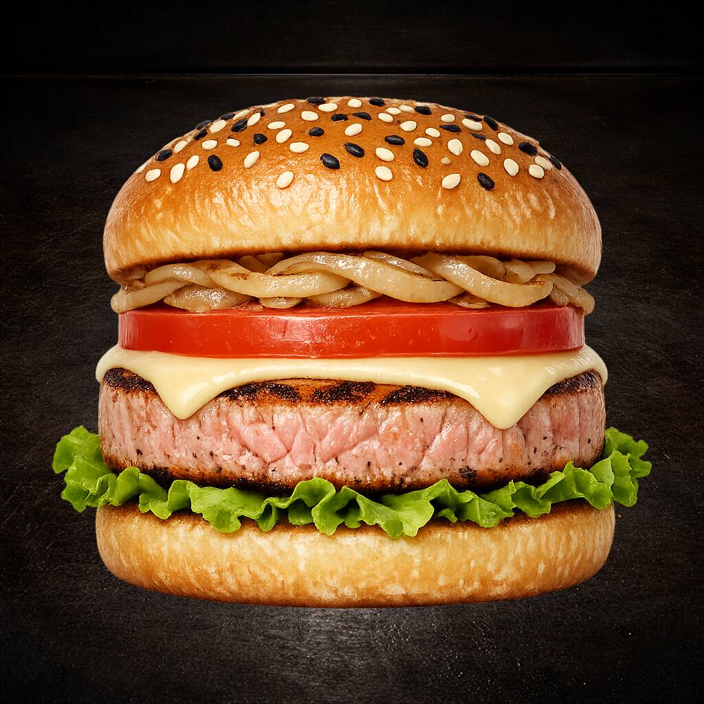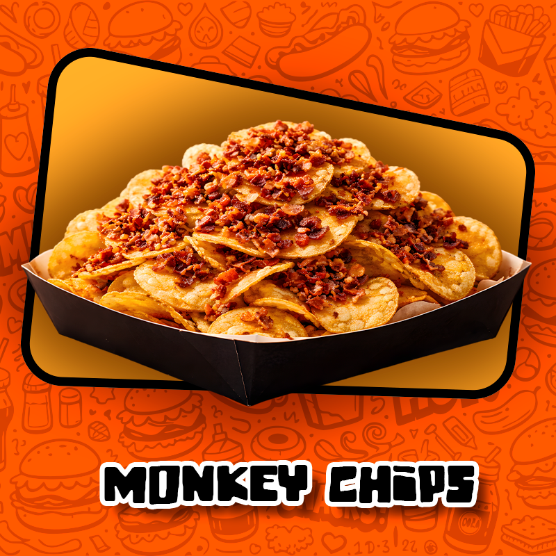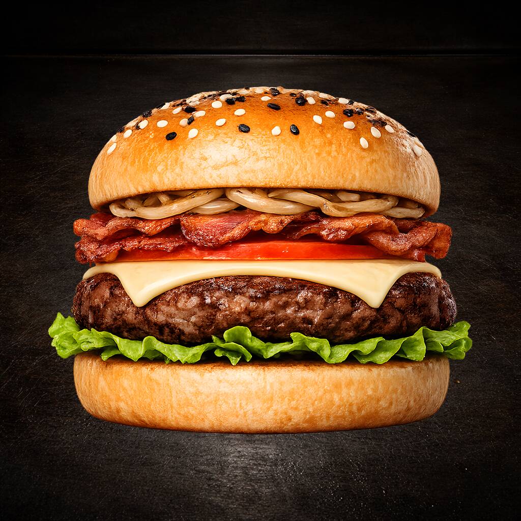 150 g. de Sirloin, tocino, queso, cebollita asada y vegetales. Forjada con fuego, carne y el crujido sagrado del tocino. Los dioses aplauden… y los monos bailan.