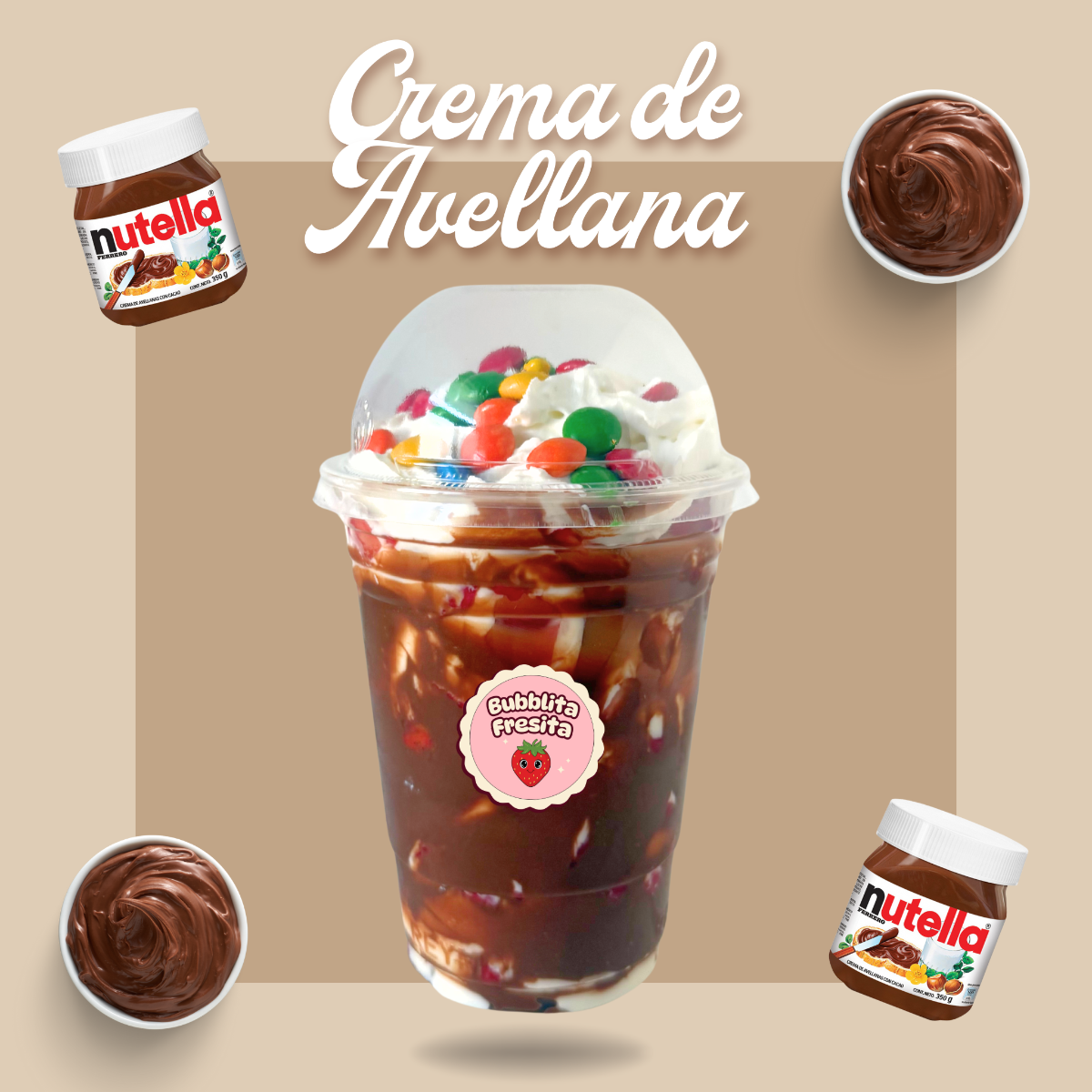 Exquisitas fresas con crema en vaso de 16 onzas, con nutella por dentro del vaso que le da un toque irresistible. Incluye 2 toppings a tu elección.