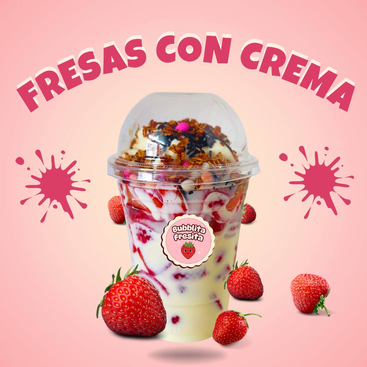 Riquísimas fresas de temporada en vaso de 16 onzas acompañadas de nuestra exquisita crema. Elige tus 2 toppings favoritos.