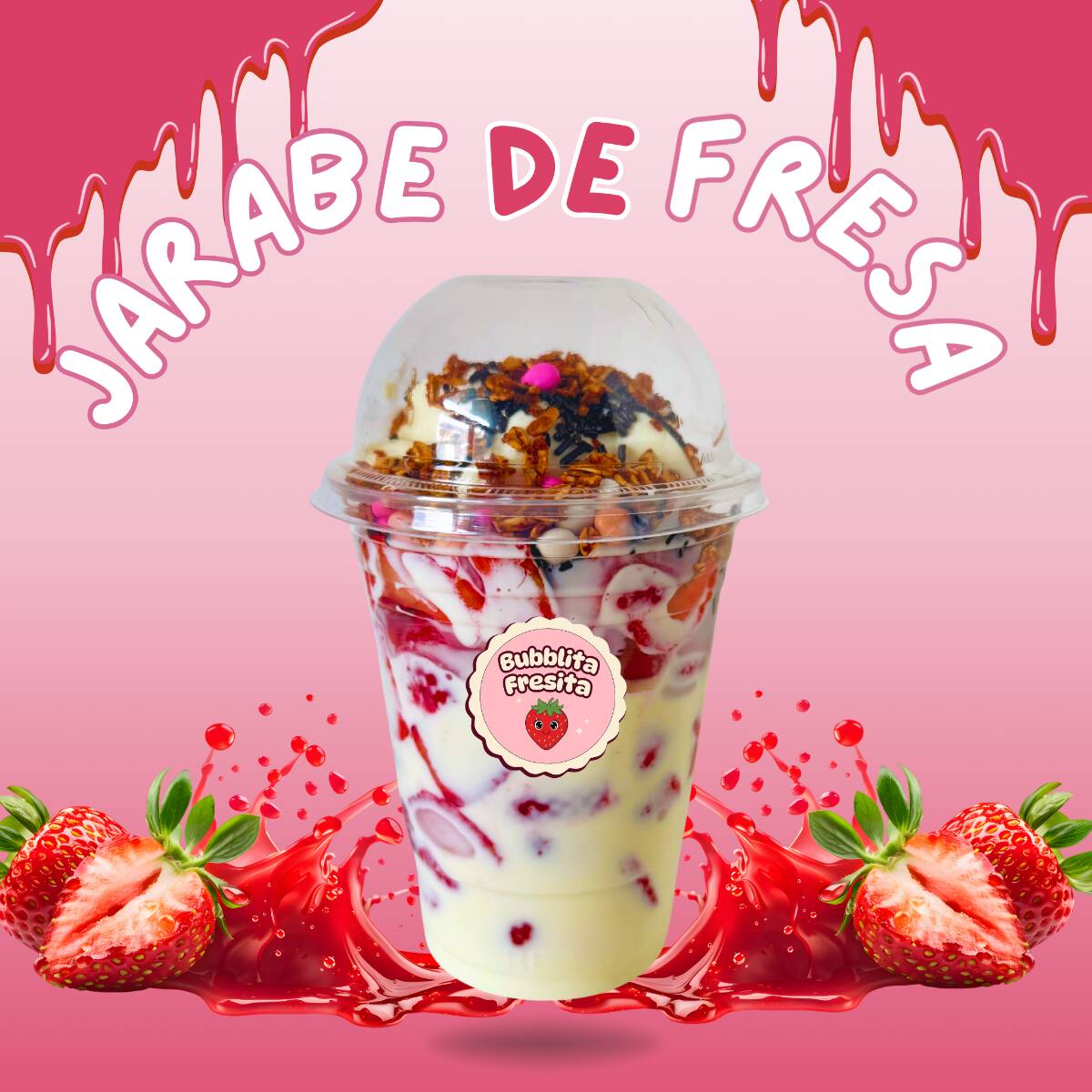 Riquísimas fresas con crema en vaso de 16 onzas, con jarabe de fresa por dentro del vaso que le da un toque irresistible. Incluye 2 toppings a tu elección