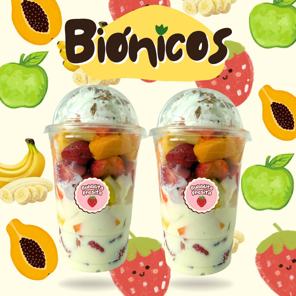 Riquísima fruta fresca en vaso de 16 onzas acompañada de nuestra exquisita crema. Elige tus 2 toppings favoritos.