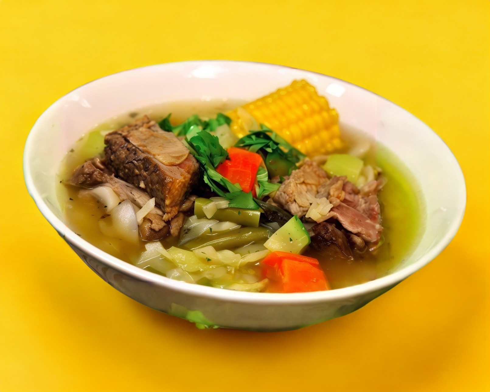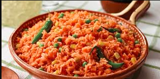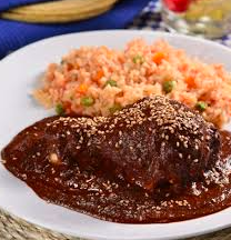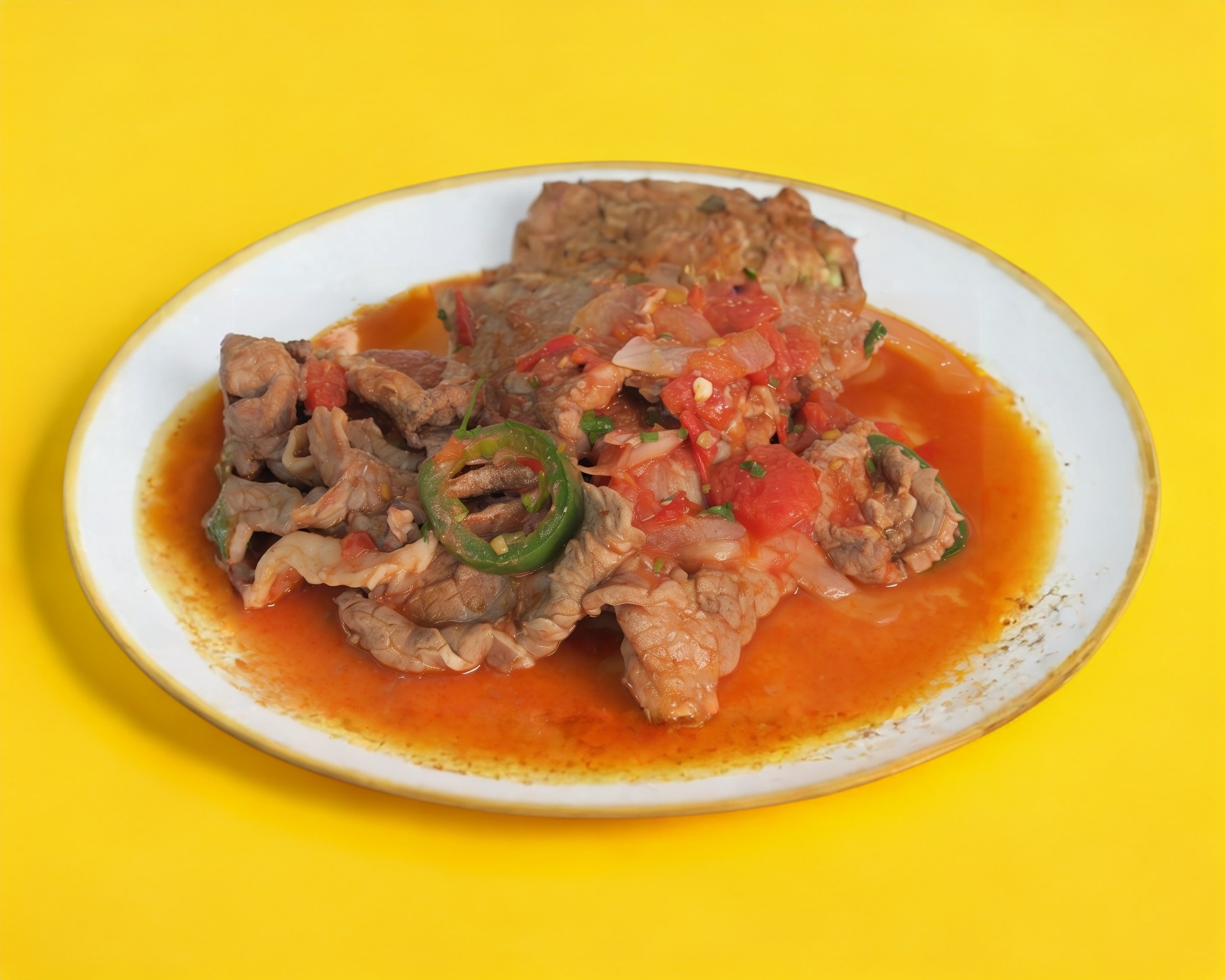 Bistec servido con una salsa a base de jitomate, cebolla, y chile serrano con guarnición de arroz y frijoles.