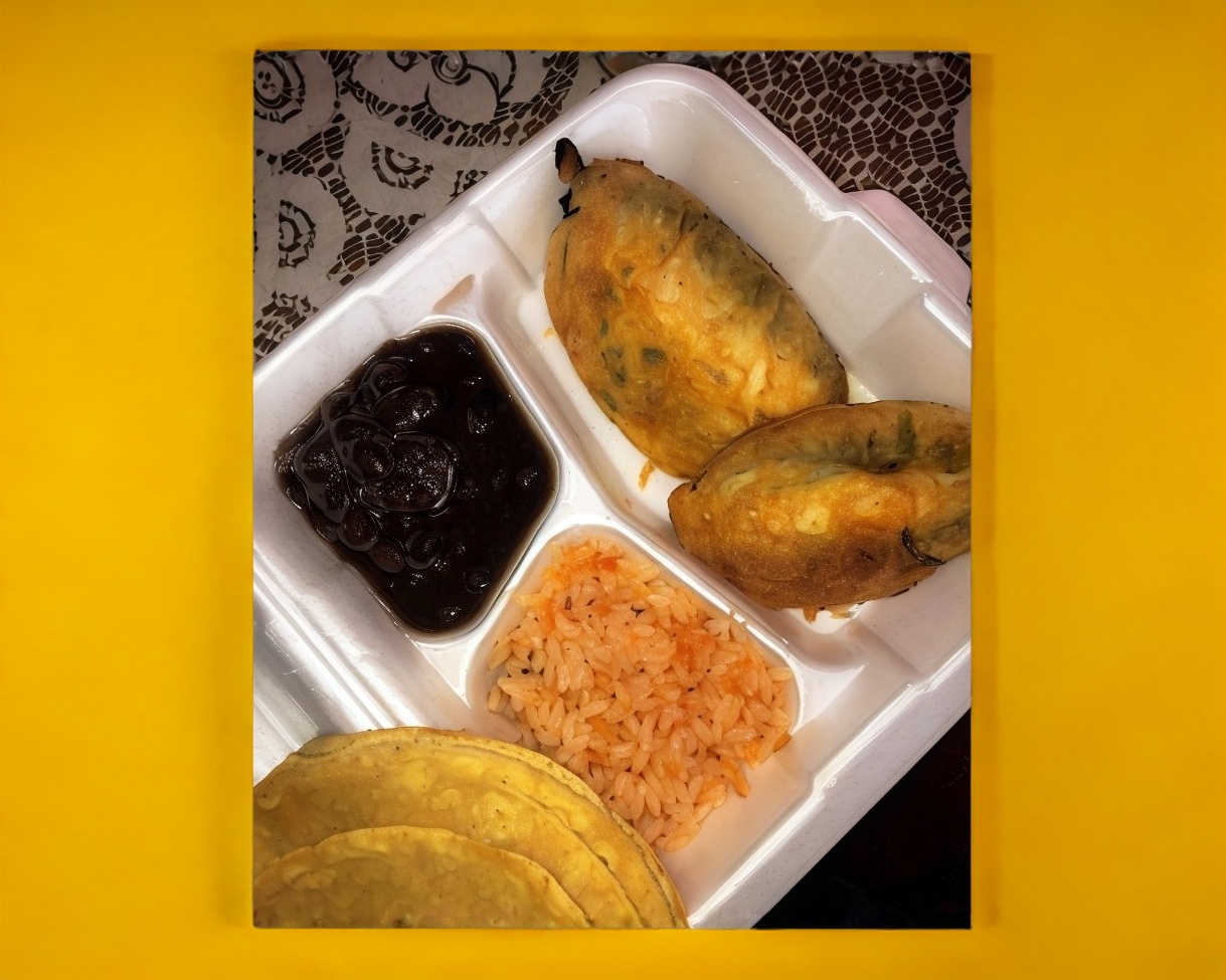 Frijoles, arroz, ensalada, tortillas, salsa, tenedor y servilletas.