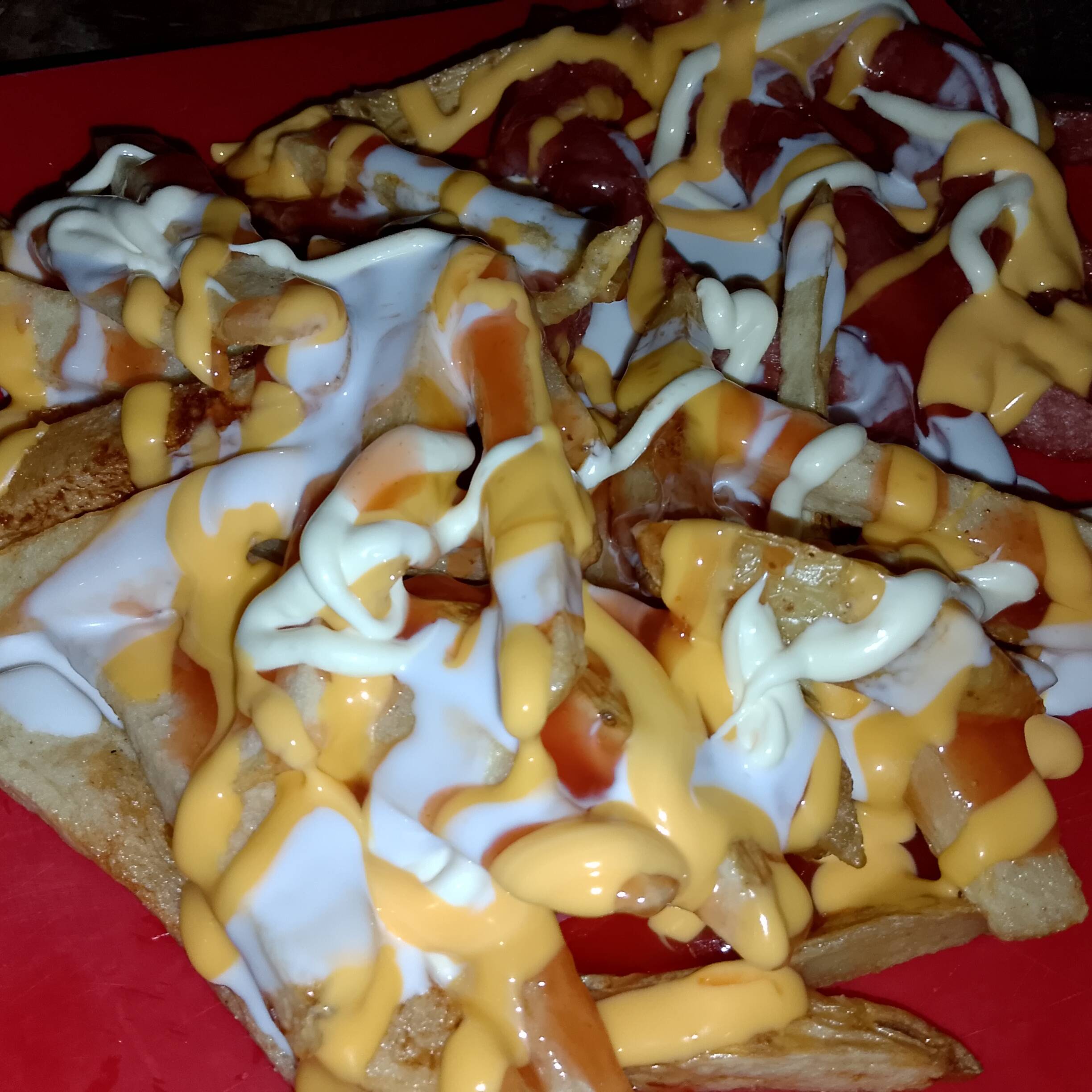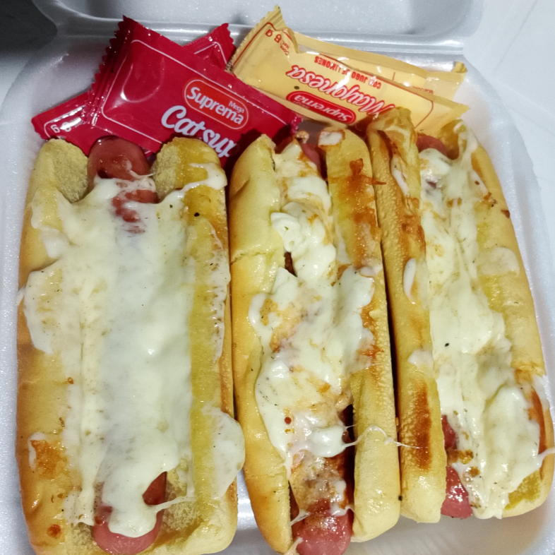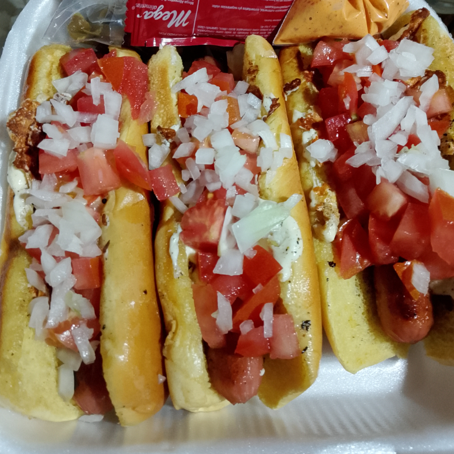 salchicha, queso asadero, jitomate, cebolla y aderezos