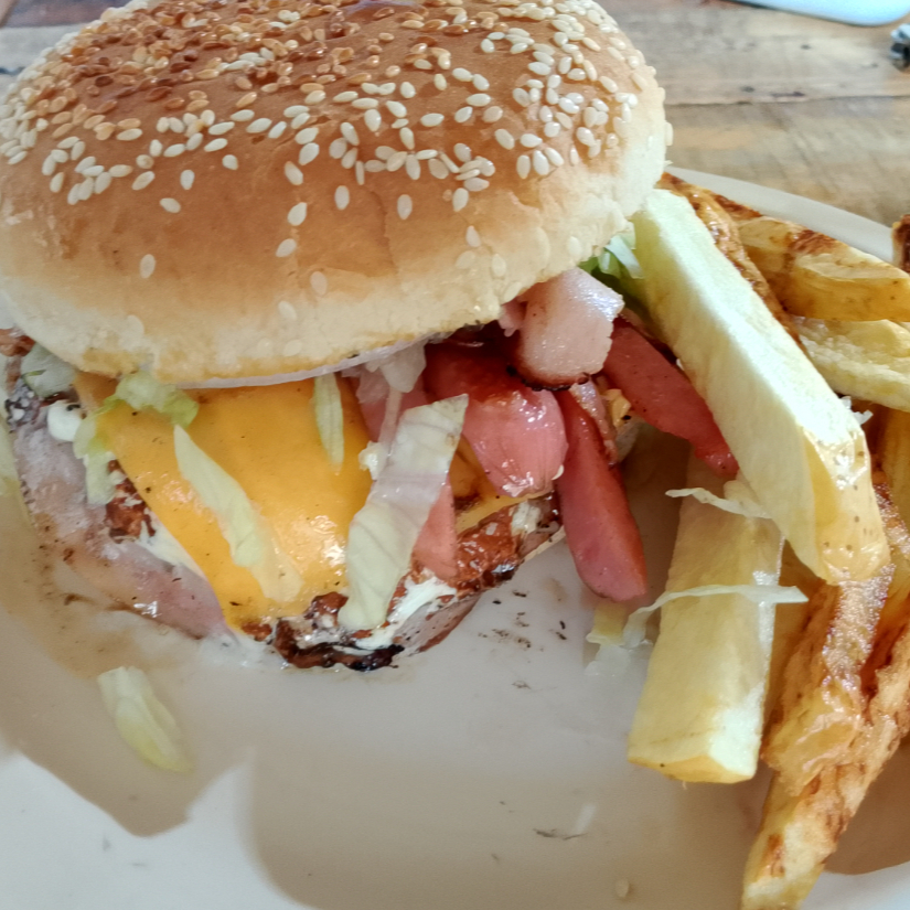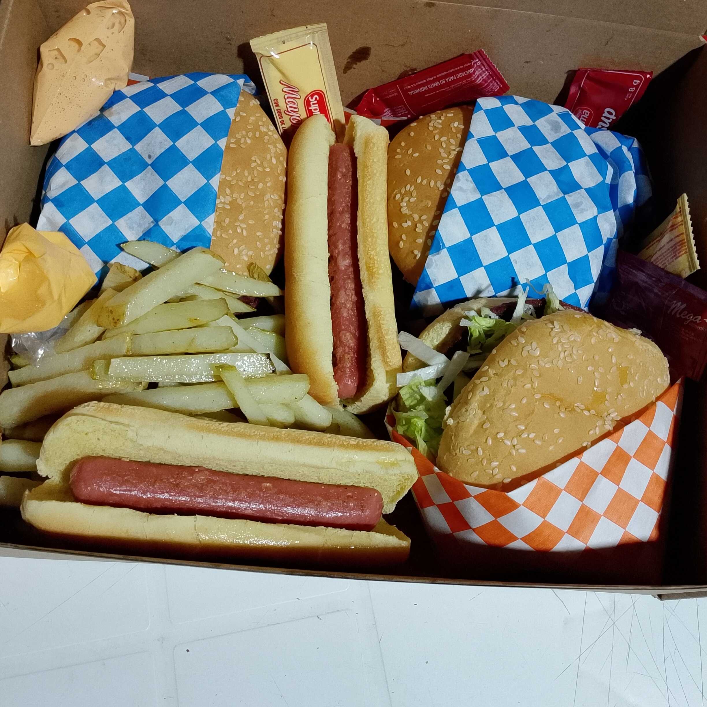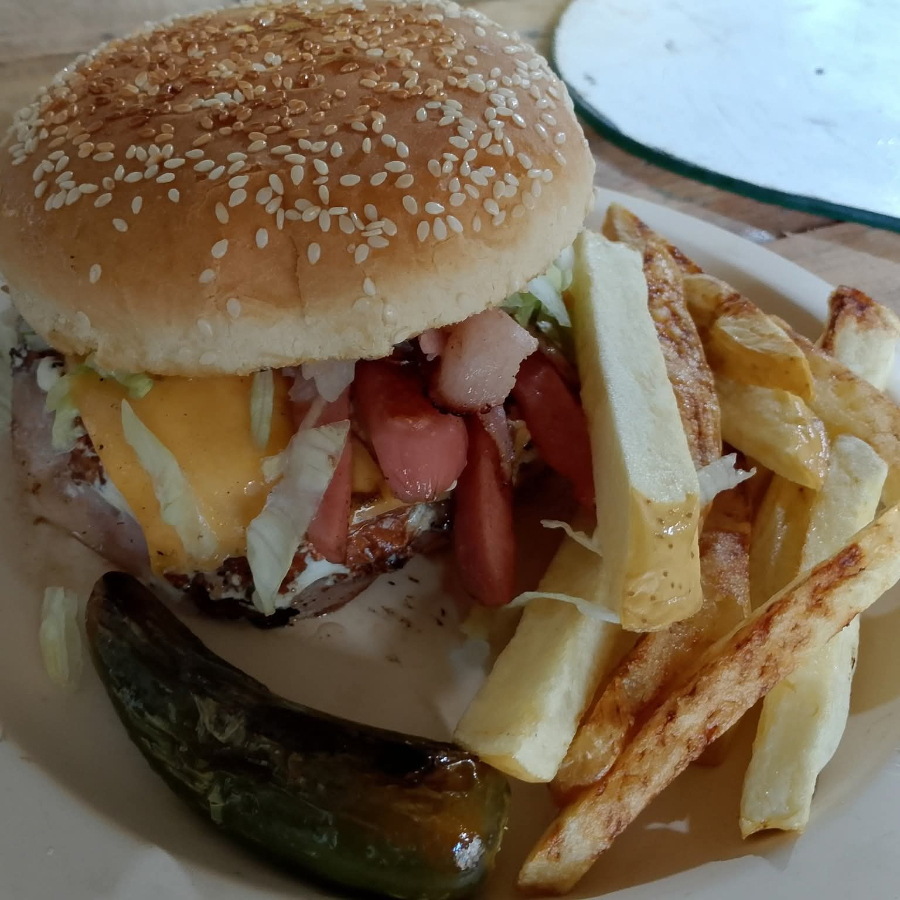 doblle carne, quesos, jamon, aderezos, lechuga. jitomate, cebolla y papas