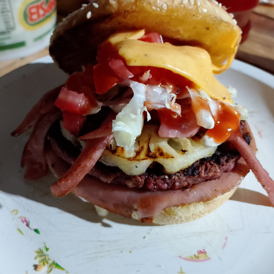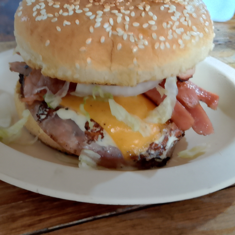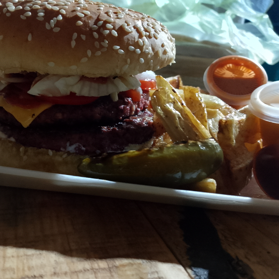 Doble carne,queso amarillo y asadero,jamón, aderezos y ensalada