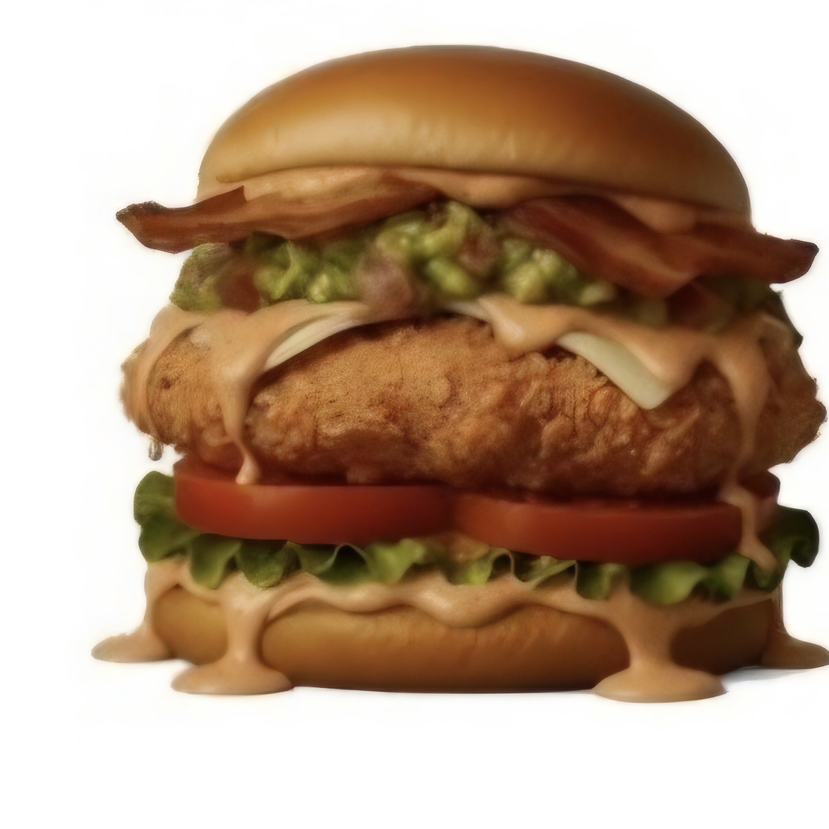 Pechuga de pollo empanizada, aderezo specy dip monsta, lechuga, jitomate, guacamole, queso manchego y tocino.