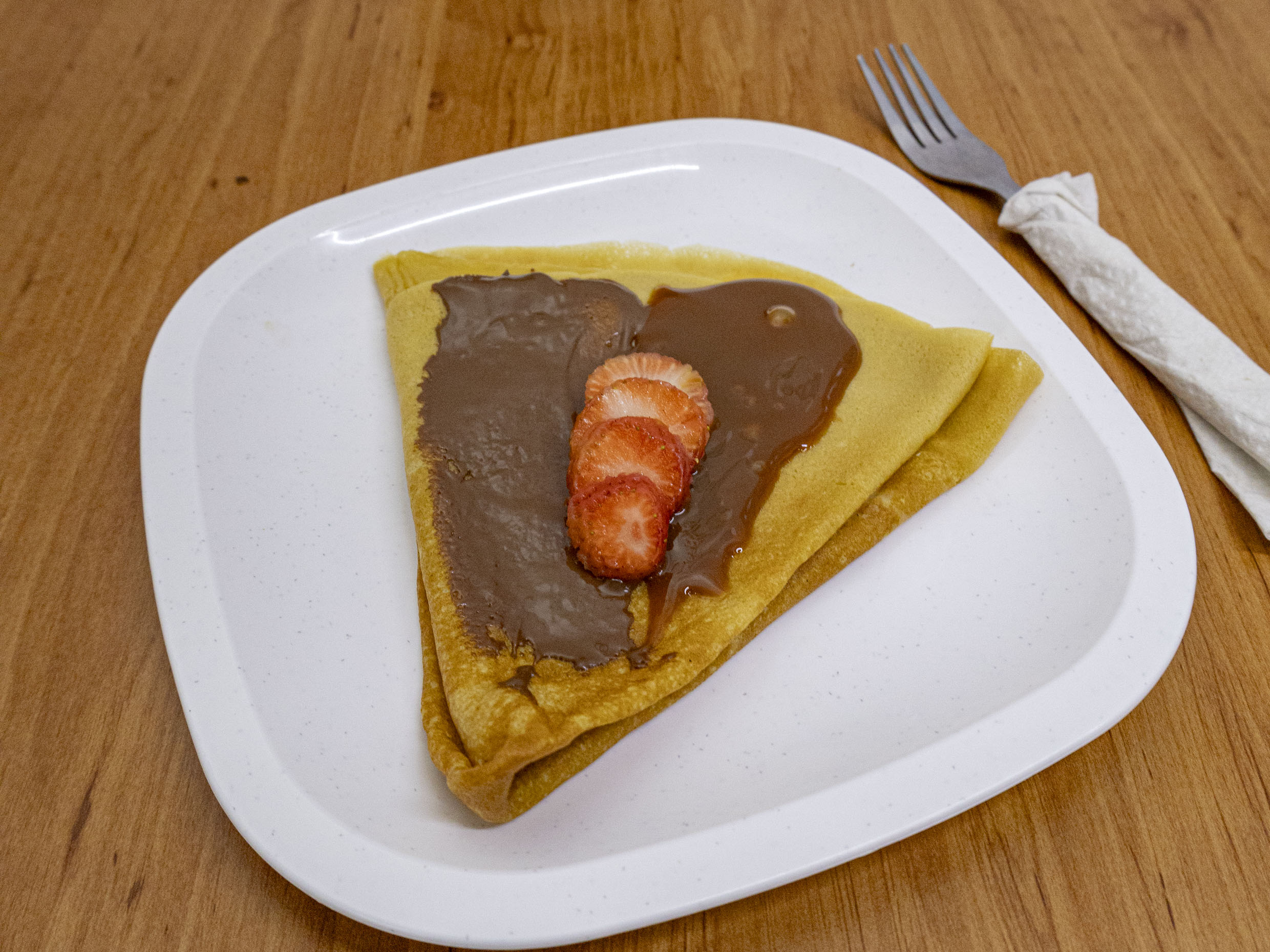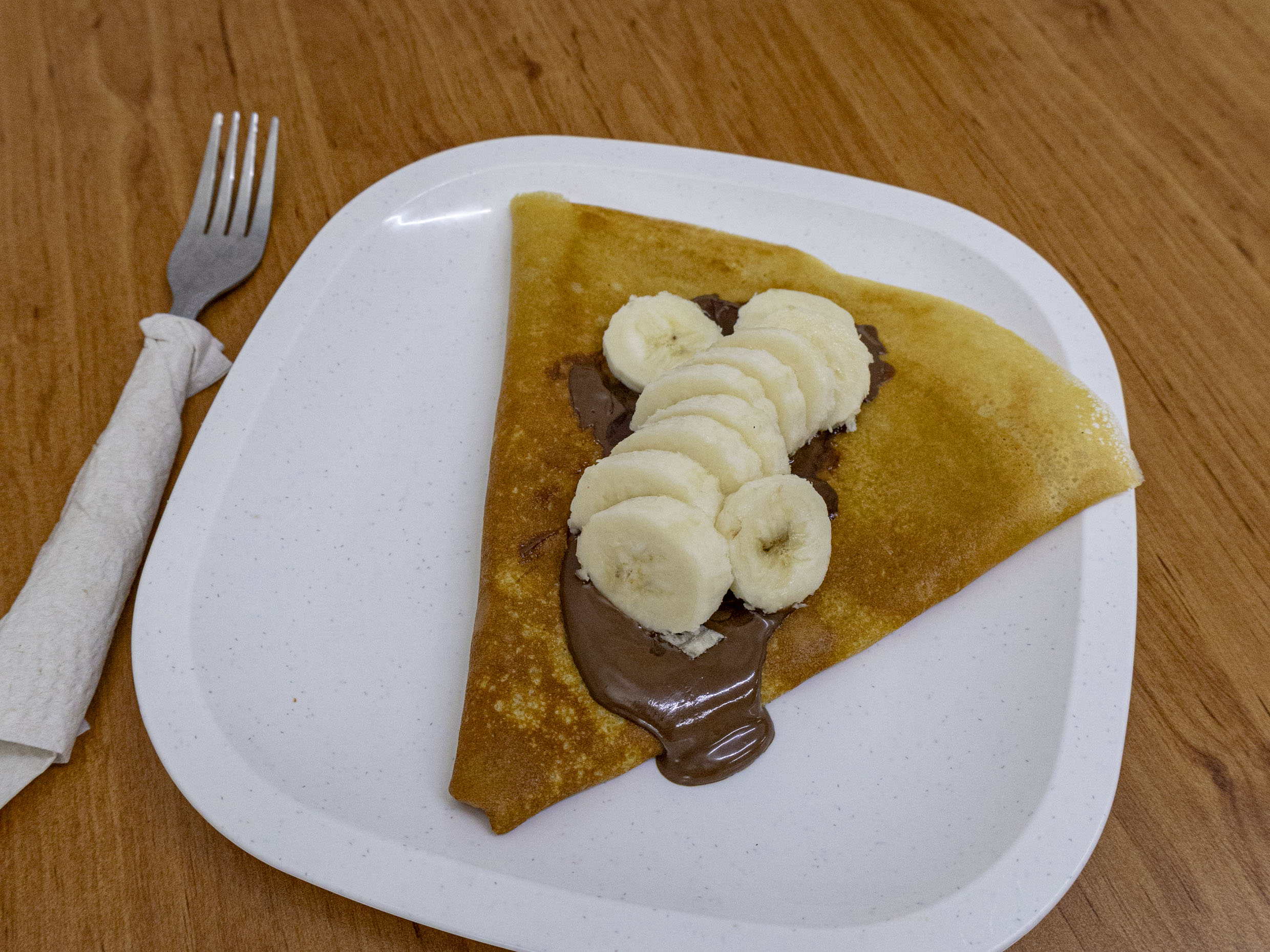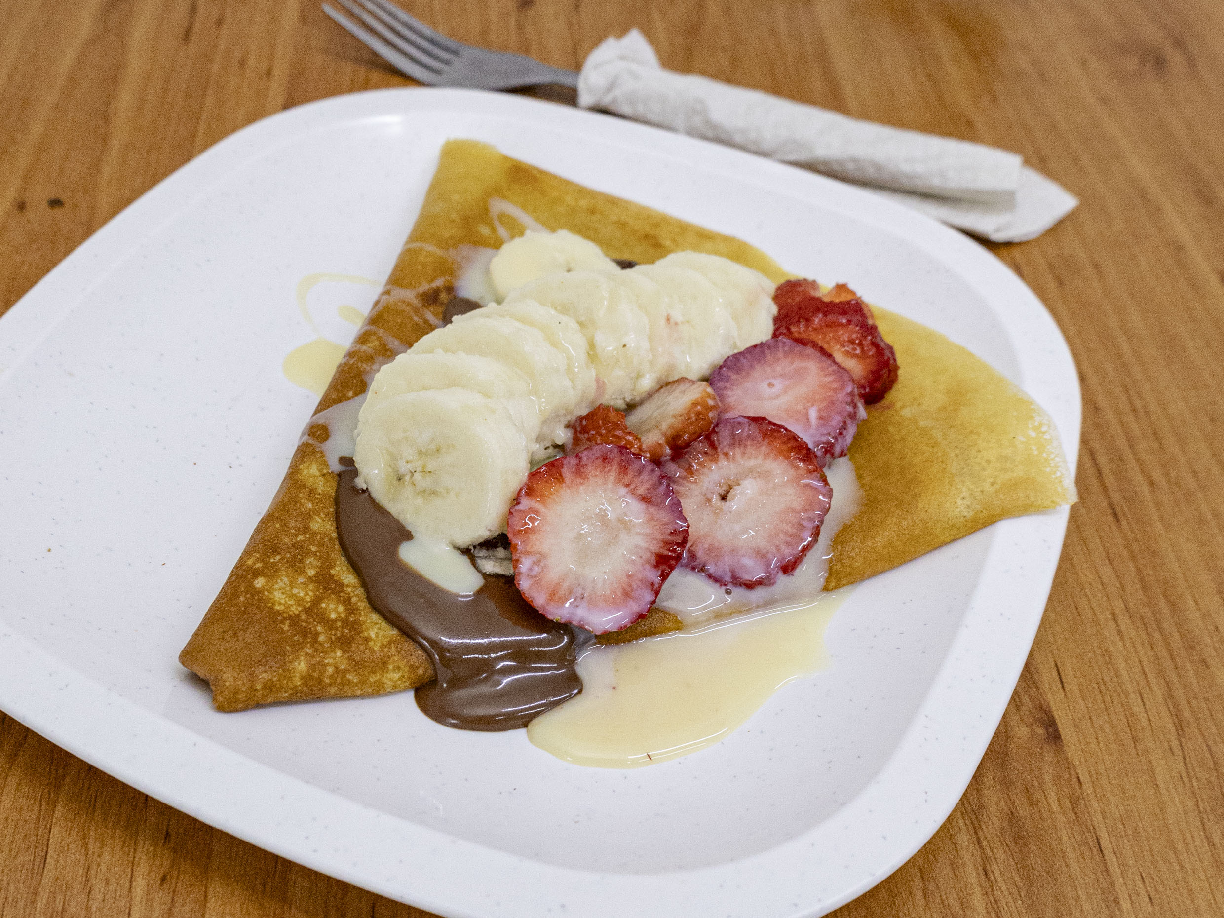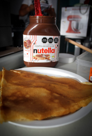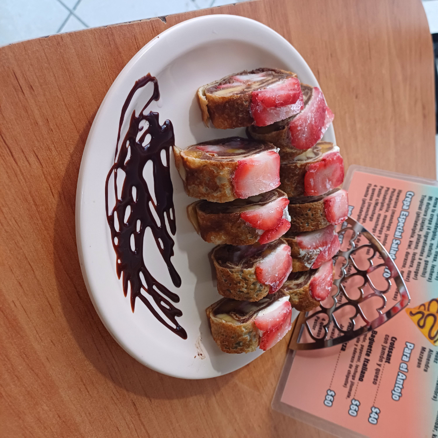 rellena de nutella,brownie,plátano,fresa,durazno enrollado con masa de crepa y decorado con Philadelphia y fresa se sirve frio
