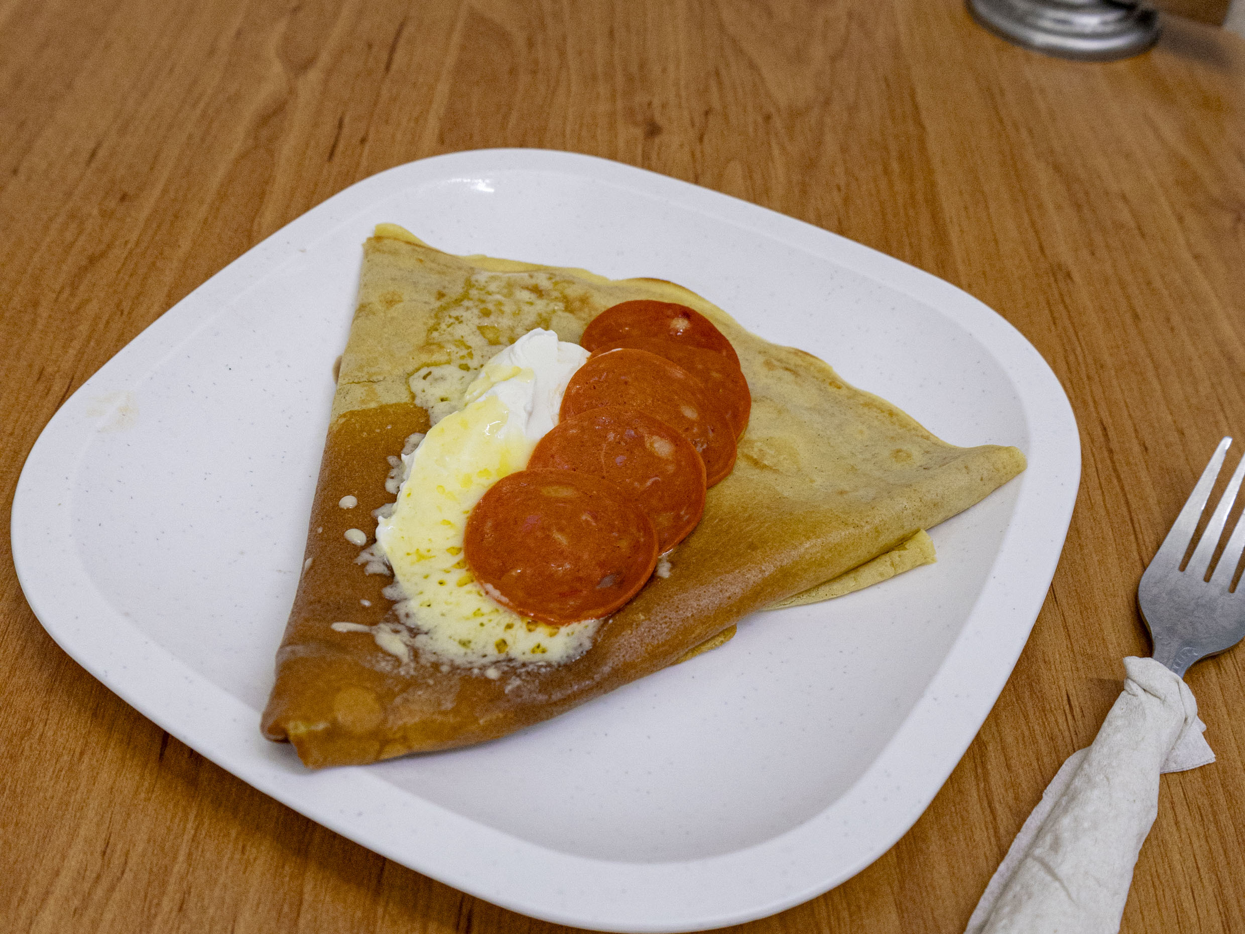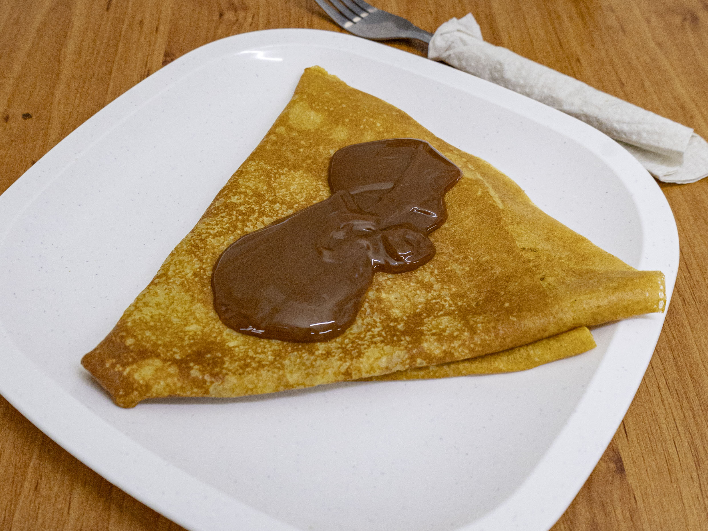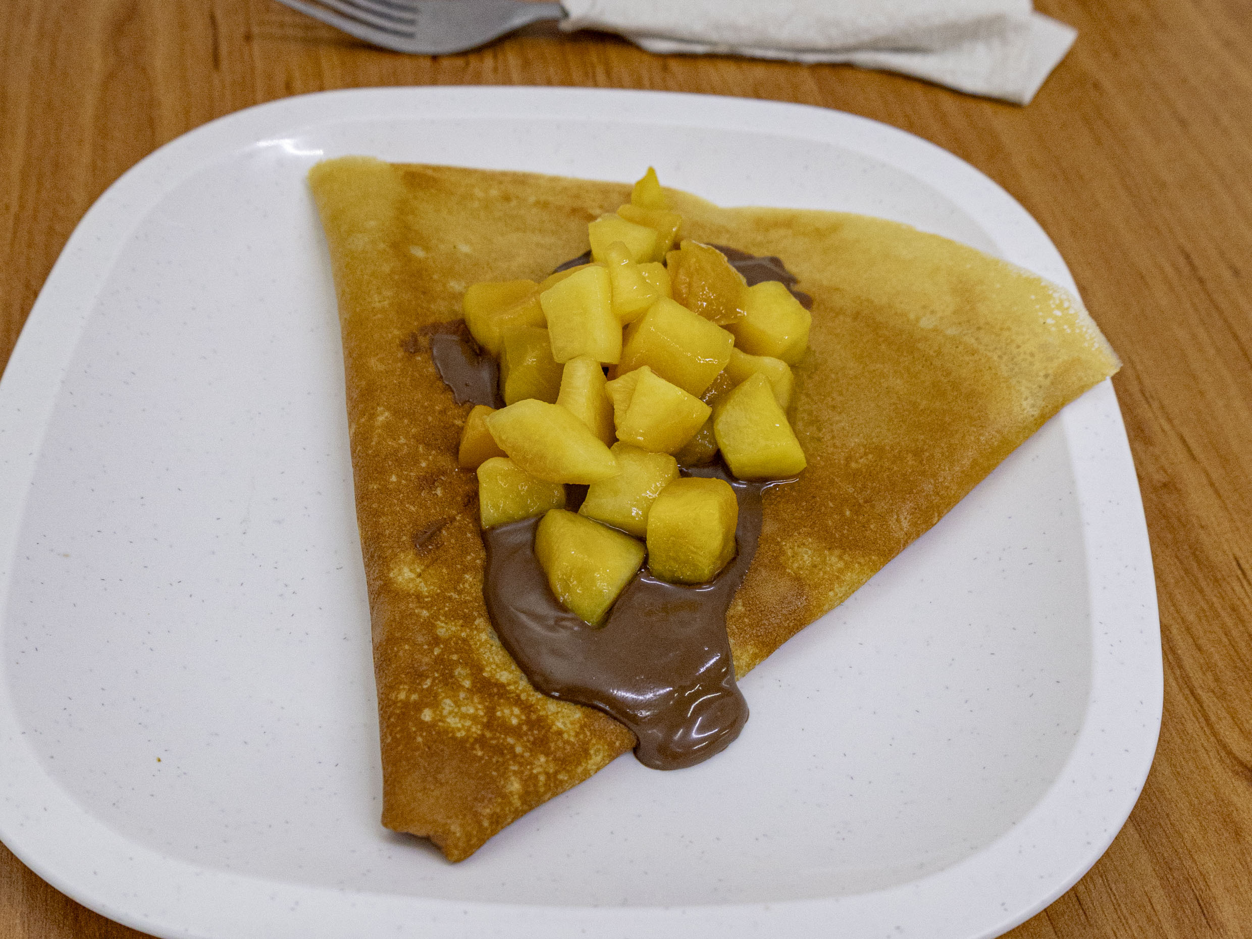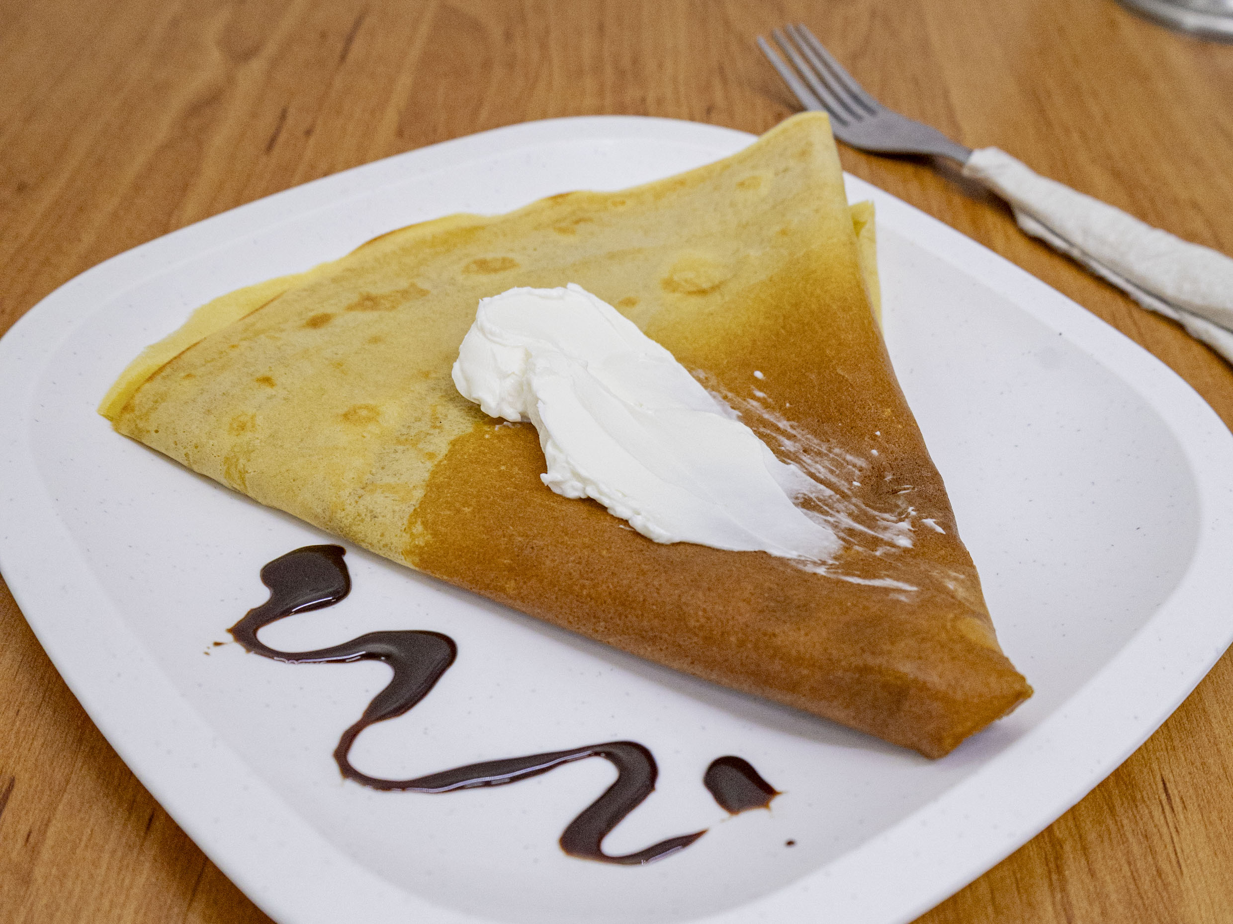 rellena de nutella,brownie,plátano,fresa,durazno enrollado con masa de crepa y decorado con Philadelphia y fresa se sirve frio