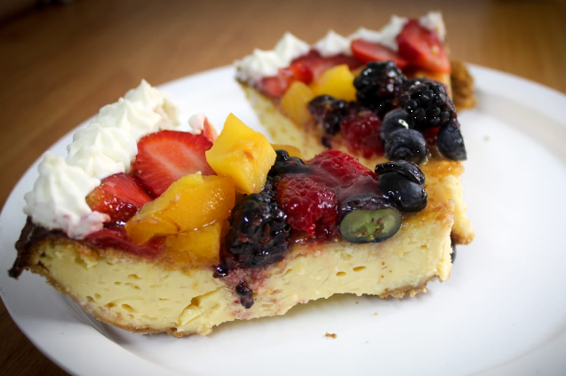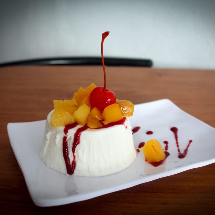 Gelatina suave de chocolate blanco con salsa de frutos rojos y duraznos.