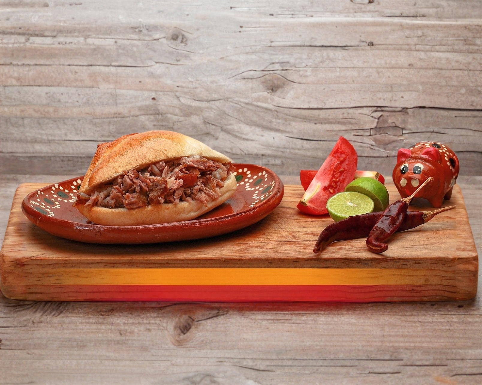 Bolillo relleno de carne, acompañada de salsa.