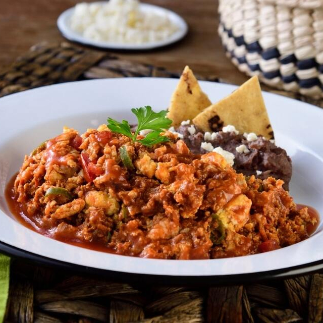 Huevos revueltos con machaca en salsa de chile guajillo, acompañado de costilla, frijoles, queso y totopos