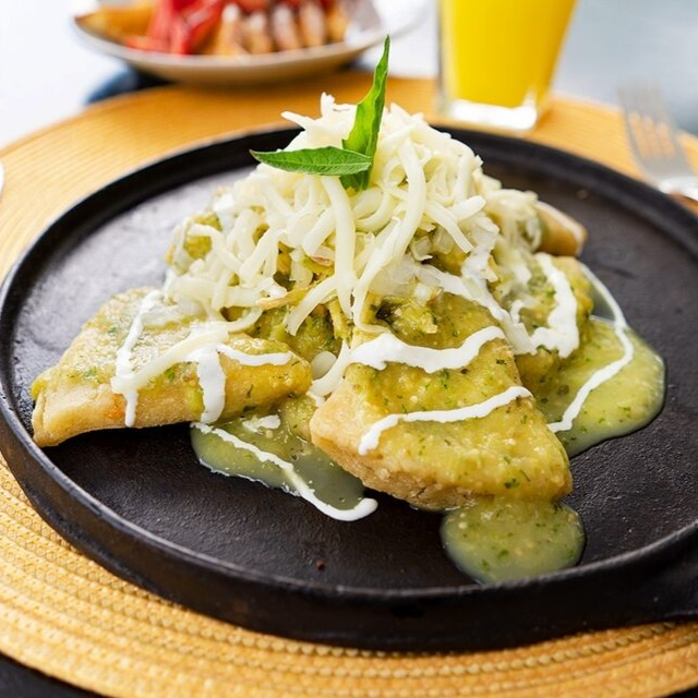 Omelette relleno de jamón con queso , cubierto de salsa de chipotle, crema y aguacate, acompañado de frijoles con queso y totopos.