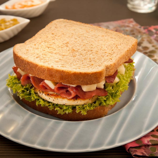 Sándwich tostado con jamón, queso panela, lechuga y jitomate