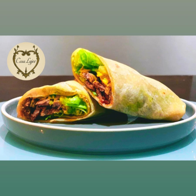 Un burrito de tortilla de harina relleno de bistec, queso asadero, aguacate, jitomate y lechuga.