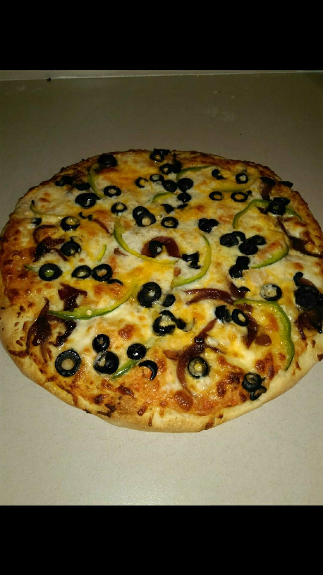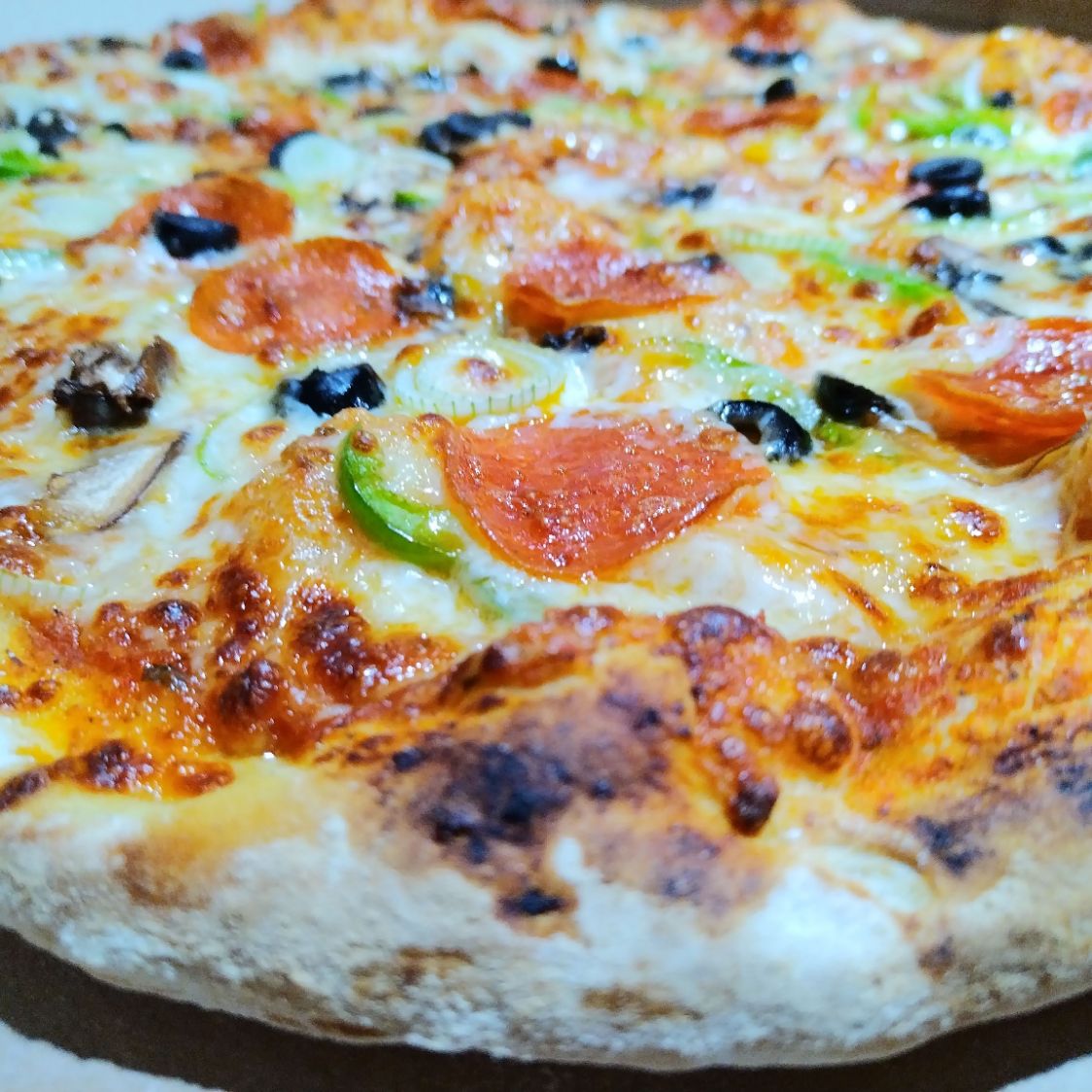 Salsa pomodoro, quesos, pimiento verde, champiñones, peperoni y aceitunas
