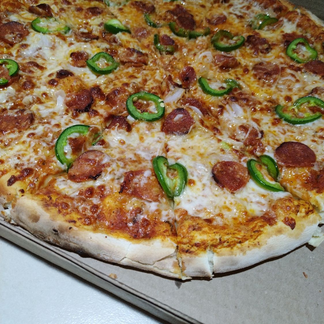 Salsa pomodoro, quesos, chorizo,cebolla y chile jalapeño