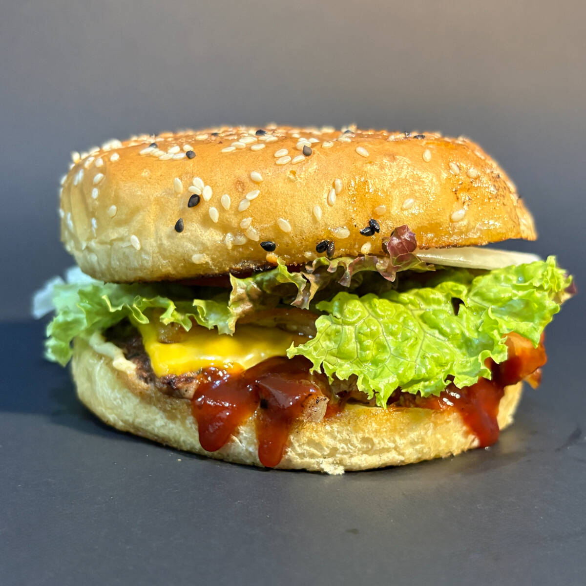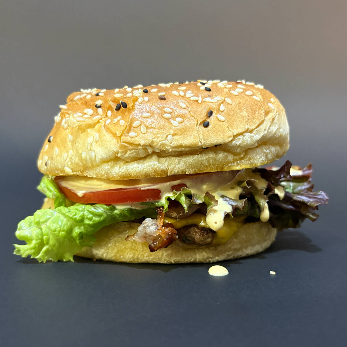 La esencial y bien hecha. Carne jugosa, queso americano, tocino y vegetales frescos