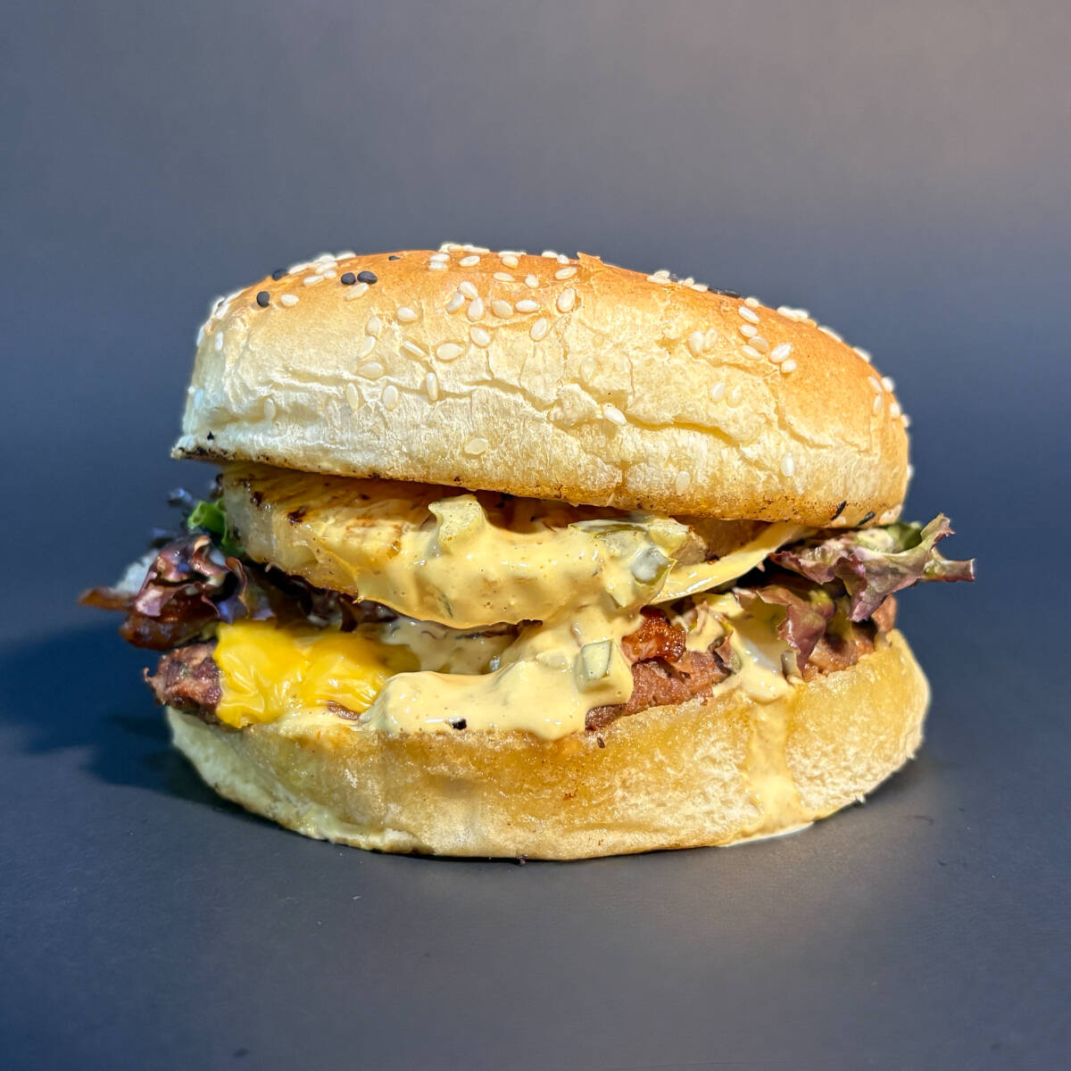 El contraste dulce-salado que nunca falla. Carne, piña asada, queso americano, tocino y vegetales frescos