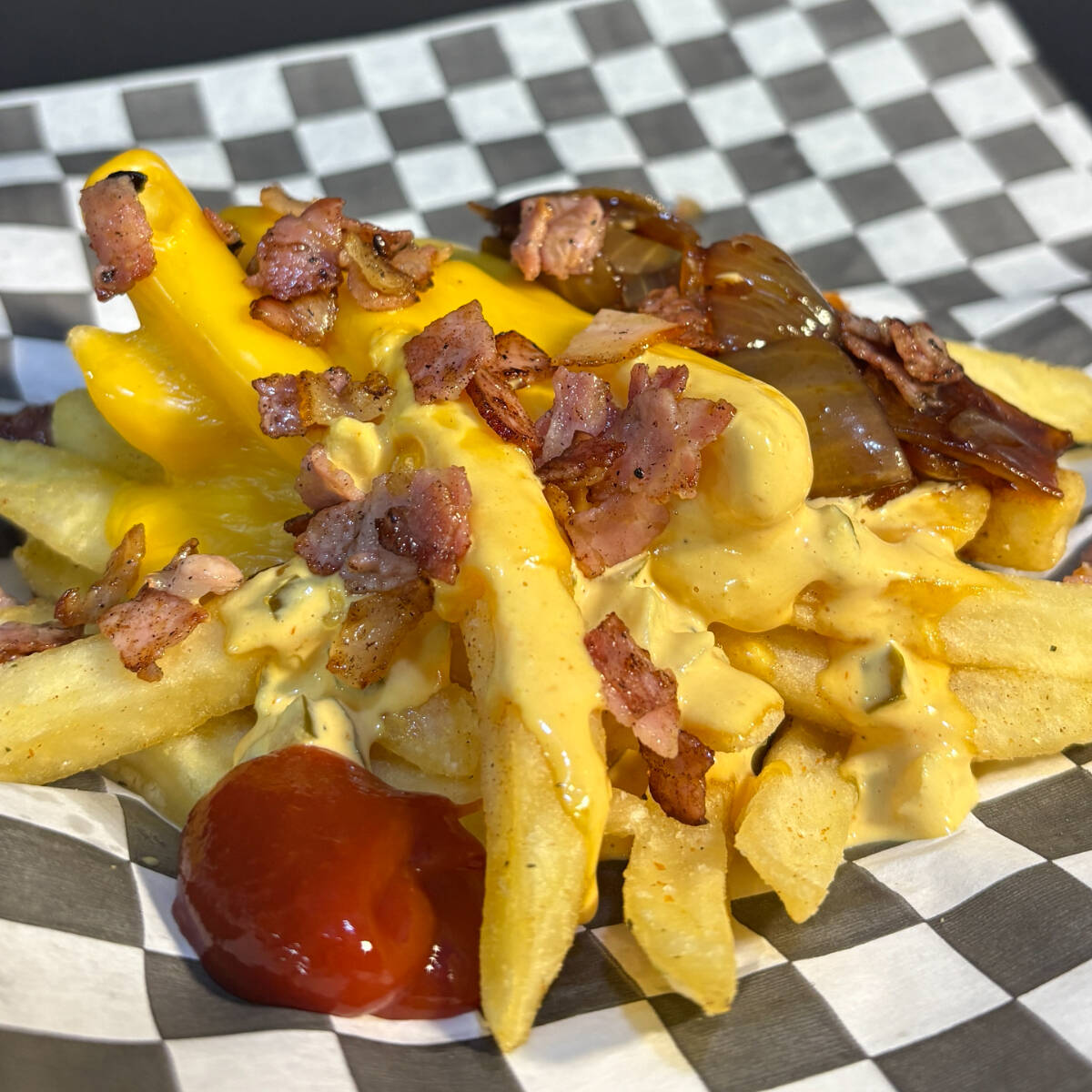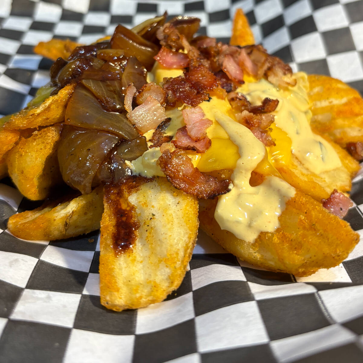 Ideales para compartir. Con queso fundido, aderezo de la casa, tocino crujiente y cebolla caramelizada