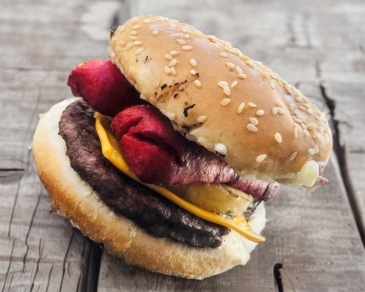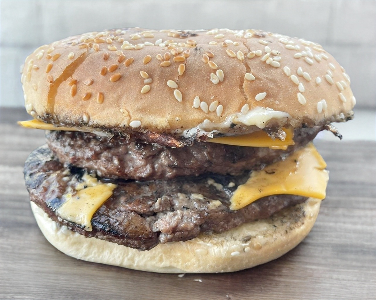 Doble carne de res, Queso Americano, Queso Mozarella, Verdura y Aderezos.
