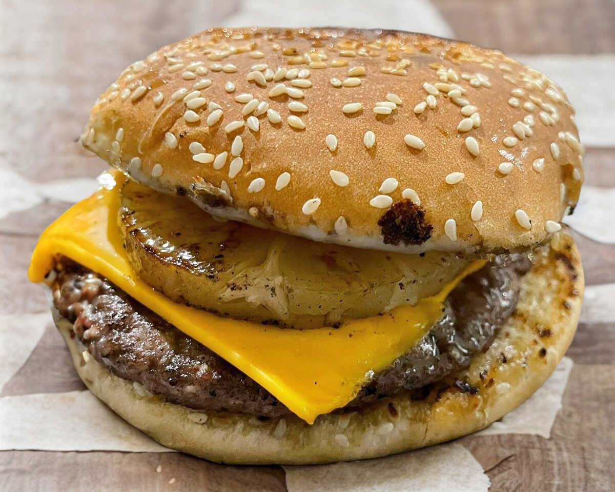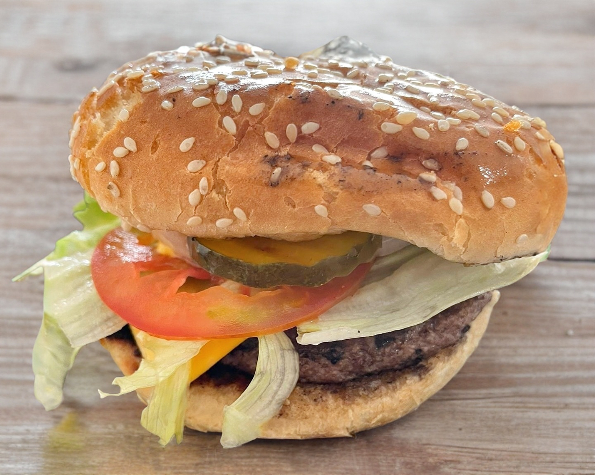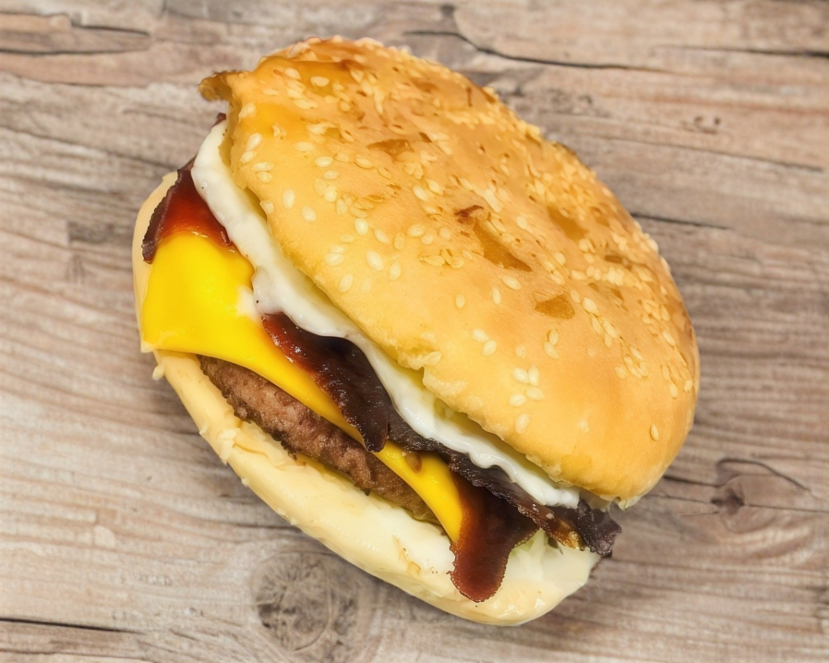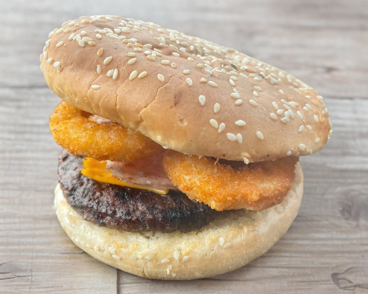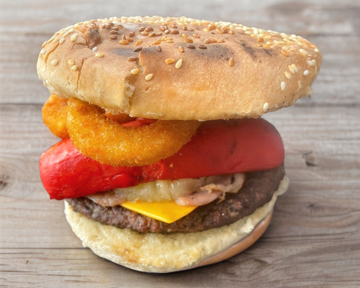 Carne de res, Tocino, Aros de cebolla, Queso Americano, Queso Mozarella, Verdura y Aderezos.