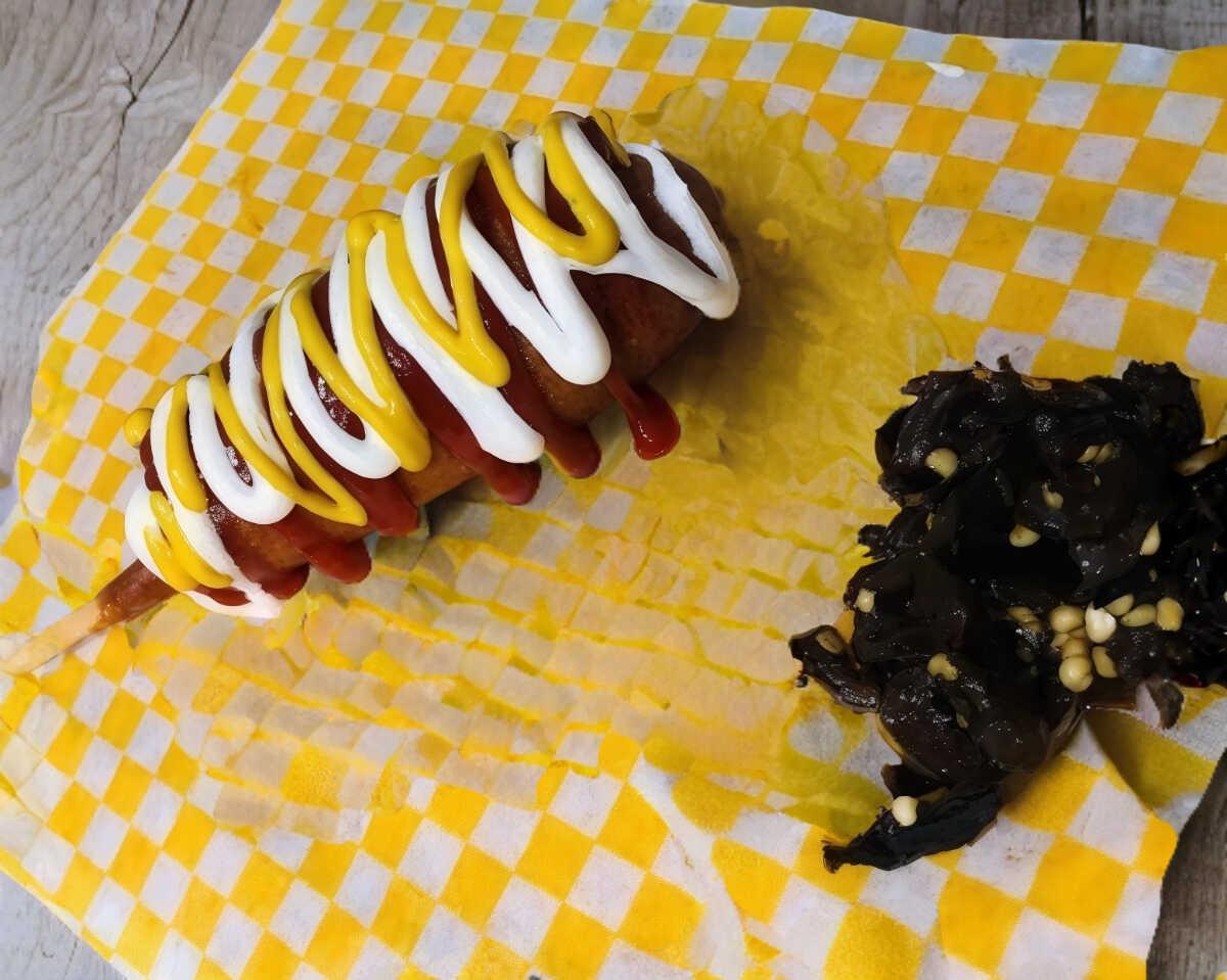 Salchicha empanizada perfectamente frita y acompañada de los aderezos de tu elección.