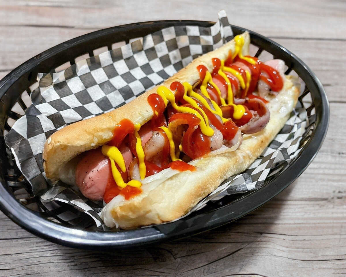 Salchichas perfectamente fritas y acompañadas de los aderezos de tu elección.