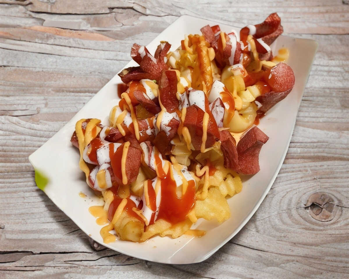 Papas y salchichas perfectamente fritas y acompañadas de los aderezos de tu elección.