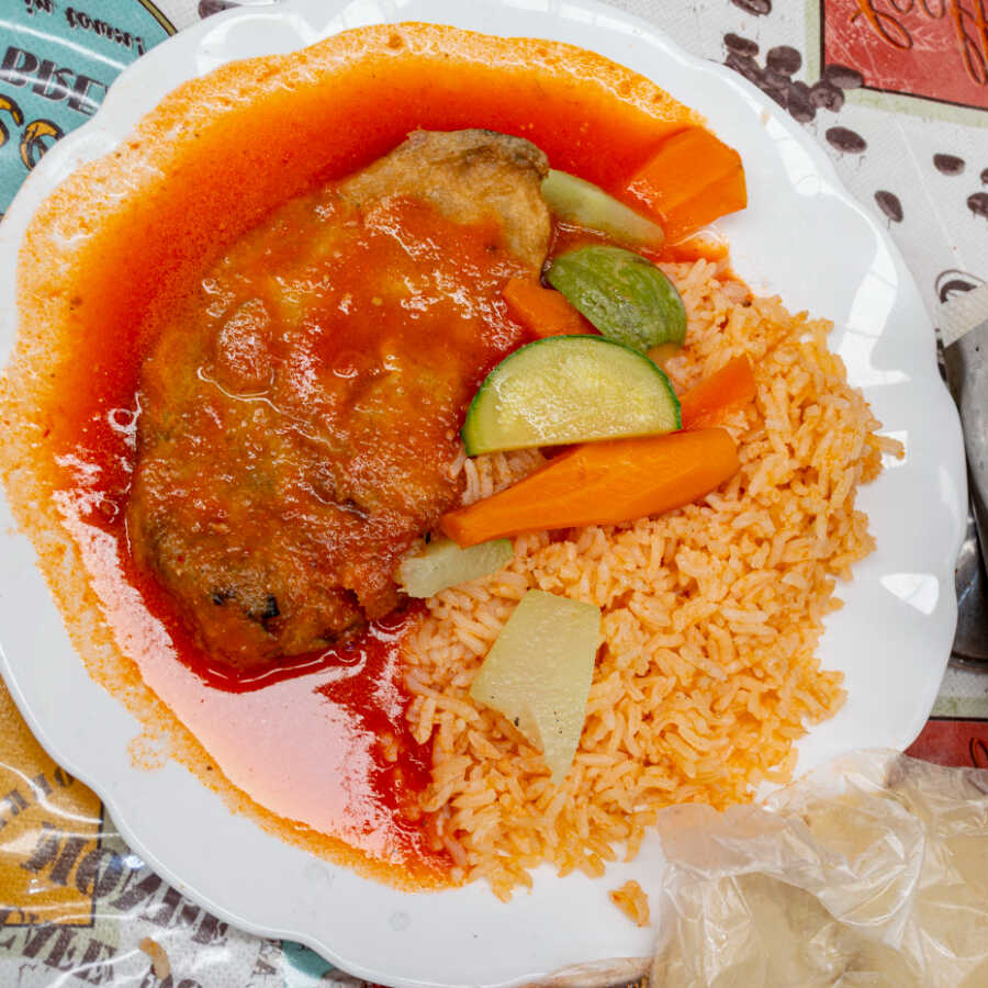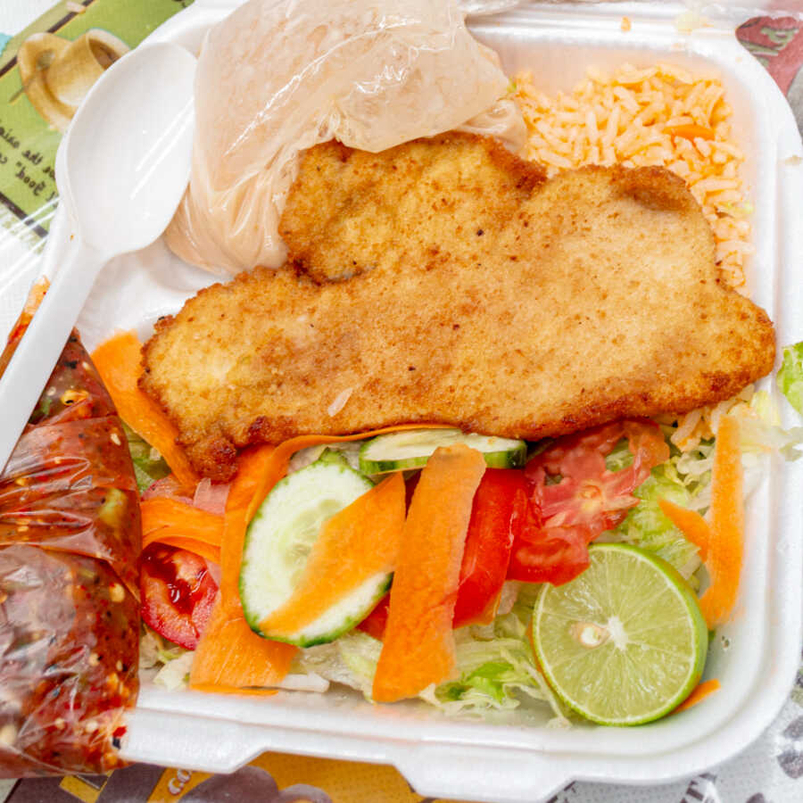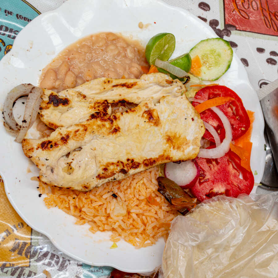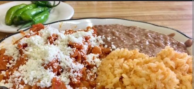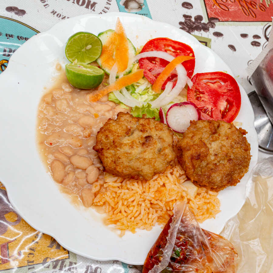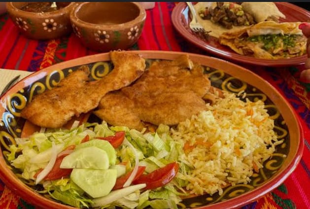 Acompañado de arroz, frijoles, salsa y tortillas.