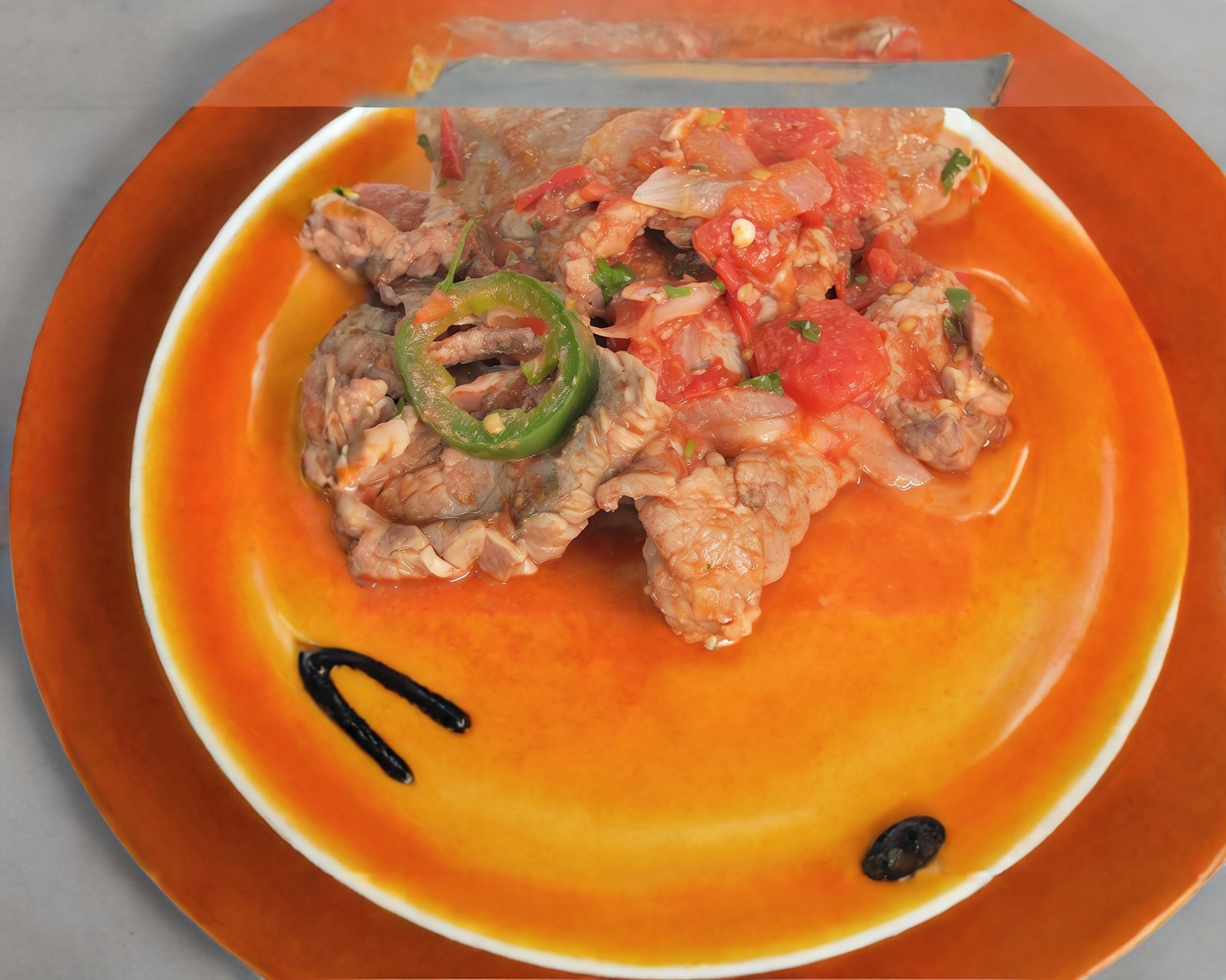 Frito a la mexicana, caldillo de jitomate y salsa verde.