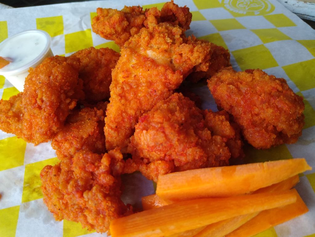 500gr de alitas con 1oz de aderezo ranch y bastones de zanahoria (alitas pesadas previamente a la cocción).