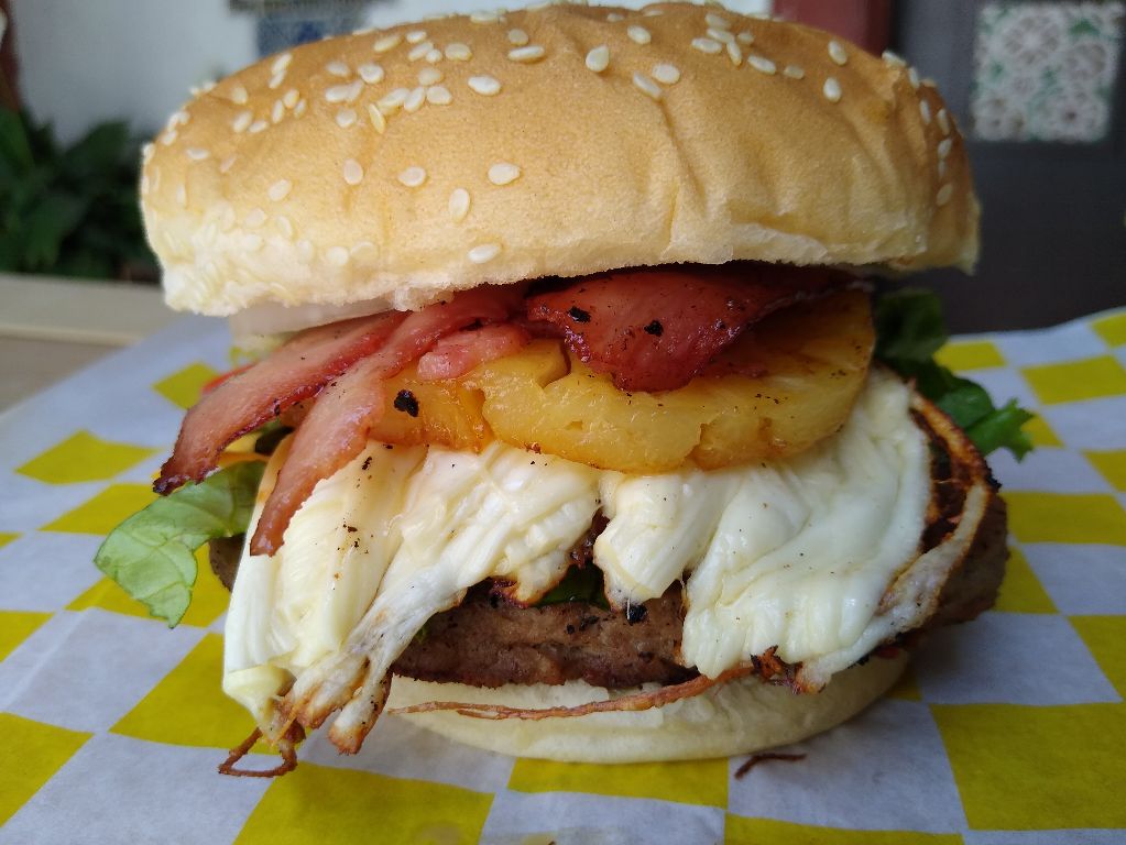 1 Pieza de carne de hamburguesa de res, doble queso, piña, tocino, lechuga, jitomate, cebolla asada, pepinillo, salsa BBQ y chile.