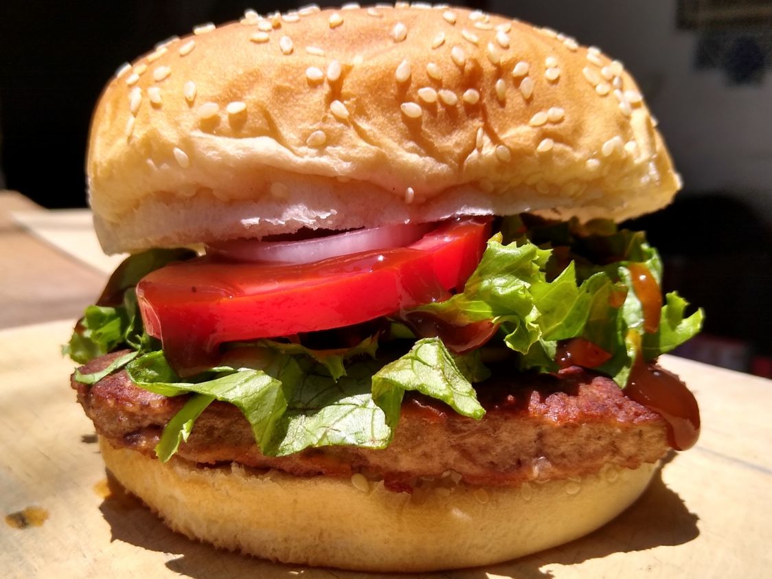 1 Pieza de carne de hamburguesa de pollo, queso, cebolla asada, jitomate, pepinillo, salsa BBQ, chile.