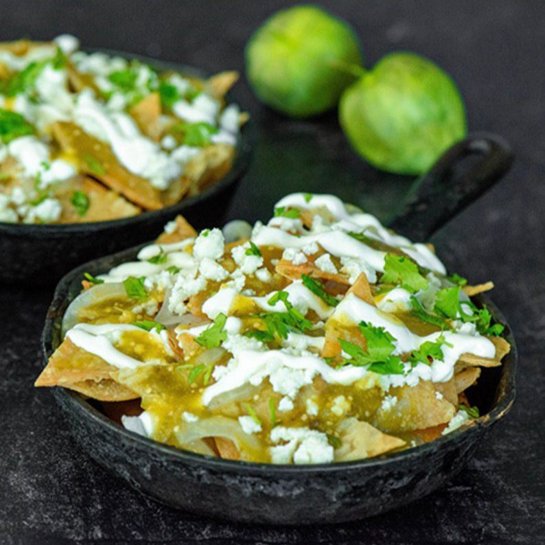 Tortilla, pollo, salsa verde, queso, crema, aguacate.