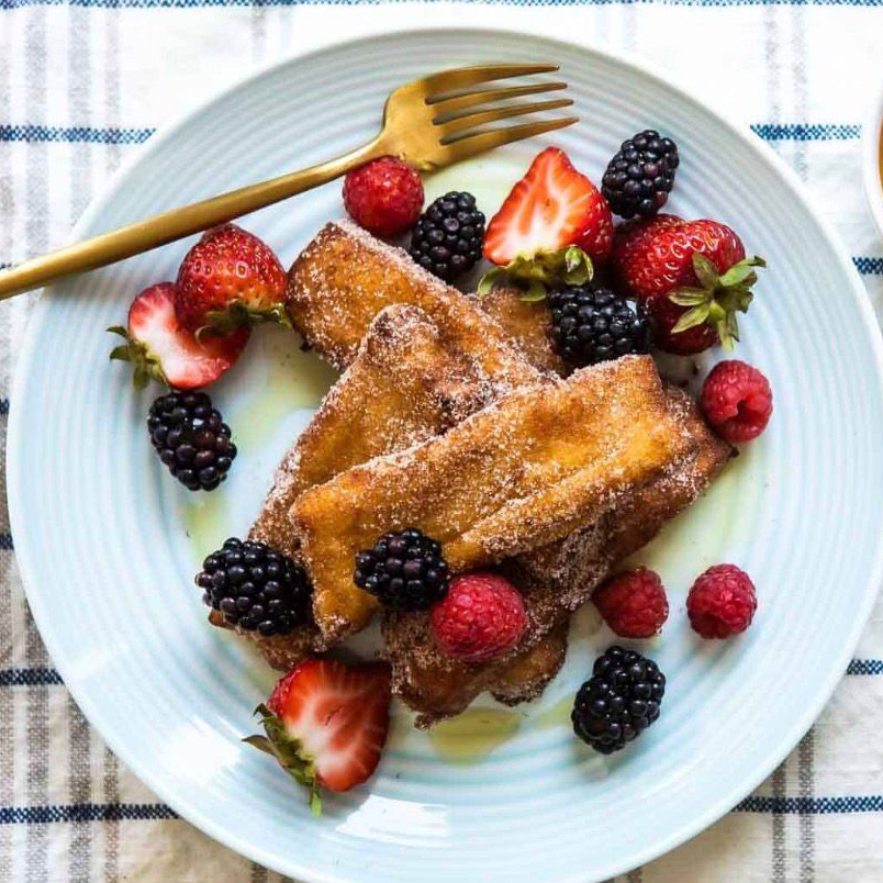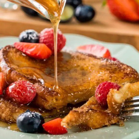 Pan fresco, fruta (fresa y plátano), azúcar glass y miel.