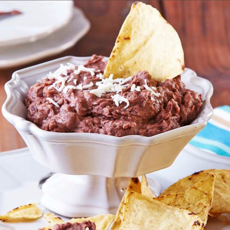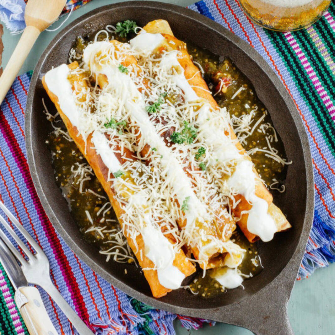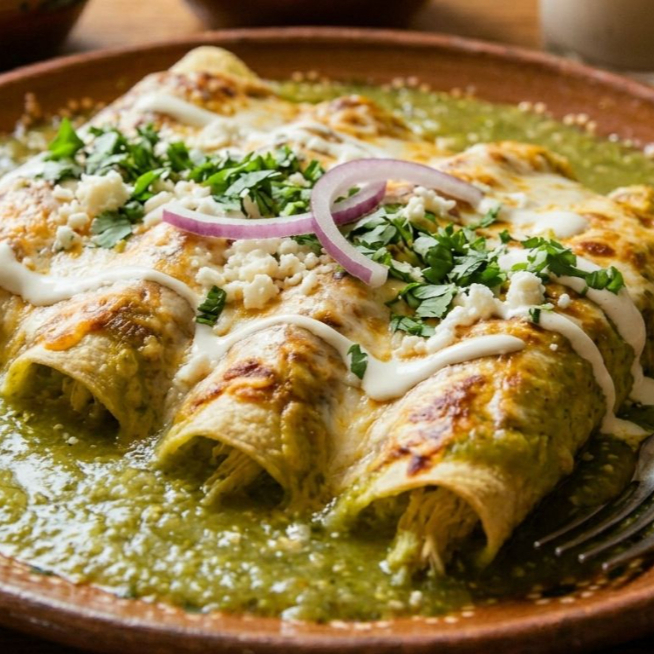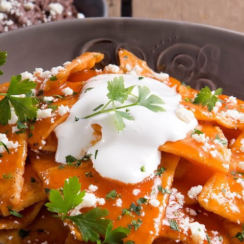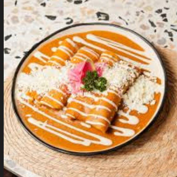 Tortilla, enfrijolada chipotle, pollo, aguacate, queso manchego y crema.