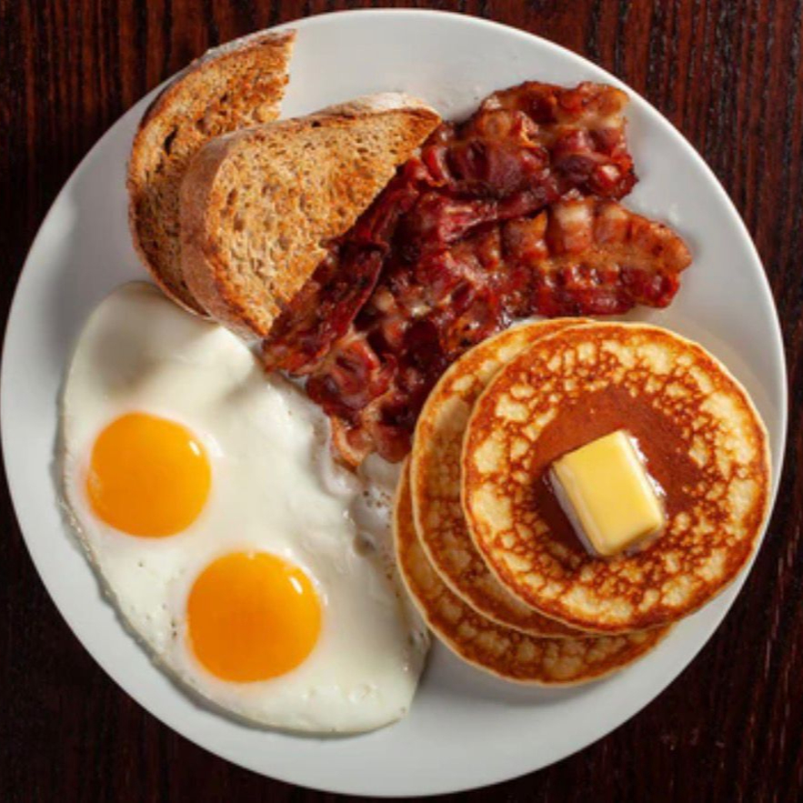 3 hot cakes con tocino o huevo, con cajeta o lechera y miel.