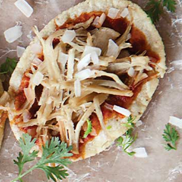 Totopo, salsa roja de la casa, queso, crema, aguacate, y proteìna (bistec o huevo)